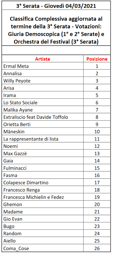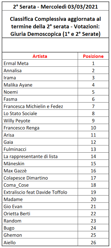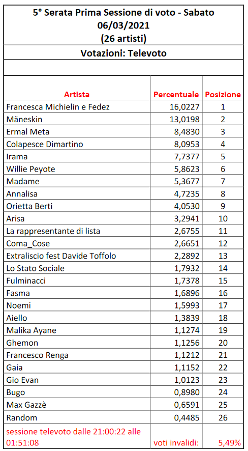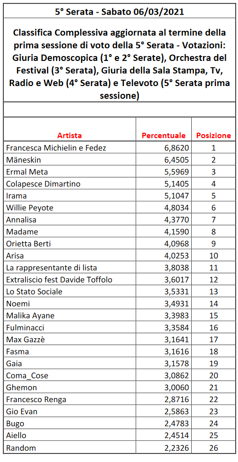 Quel che è certo è che, rispetto alla classifica generale aggiornata alla sera prima, il duo Michielin/Fedez ha recuperato ben 16 posizioni grazie al televoto, ma a trarre grande beneficio dal voto “popolare” è stata anche Madame (+10 posizioni, passando da 18a a 8a). Al contrario, l’artista che ha perso più posizioni nella classifica generale (7) per via del televoto è stata Arisa, che è scivolata dal terzo posto al decimo. I Måneskin hanno invece guadagnato 3 ulteriori posizioni grazie al televoto, mentre Ermal Meta ne ha perse 2.