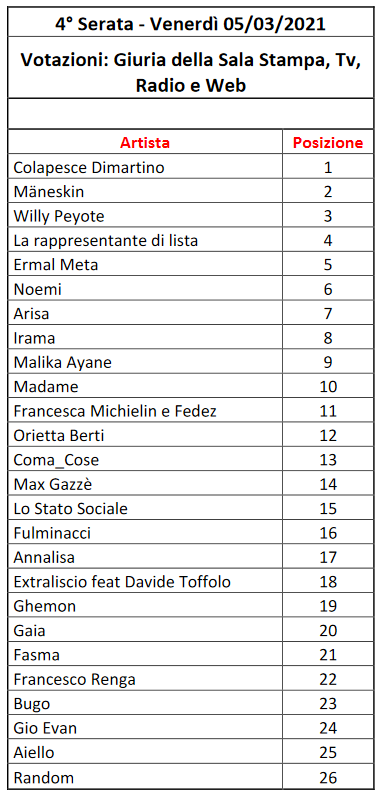 La vera serata di svolta, però, è stata la quarta, quella di venerdì: in seguito all’esibizione di tutti e 26 gli artisti in gara, i Måneskin sono stati premiati con il 2° posto, dietro a Colapesce e Dimartino, dalla giuria della sala stampa, TV, radio e web.