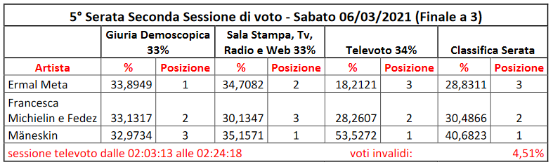 Questa classifica generale è servita per determinare l’accesso alla finalissima a tre, a cui hanno preso parte Michielin/Fedez con il 6,9%, i Måneskin con il 6,5% e Ermal Meta con poco meno del 5,6%.