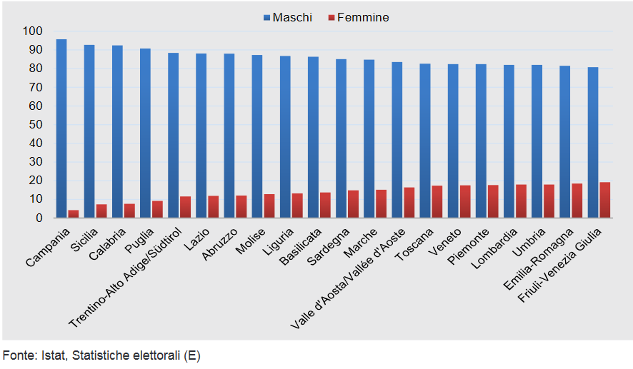 In generale, come riporta l’Istat, l’85,5% dei quasi 8.000 sindaci in carica sono uomini, un dato che sale sopra il 95% in Campania e “scende” all’80% in Friuli Venezia Giulia.