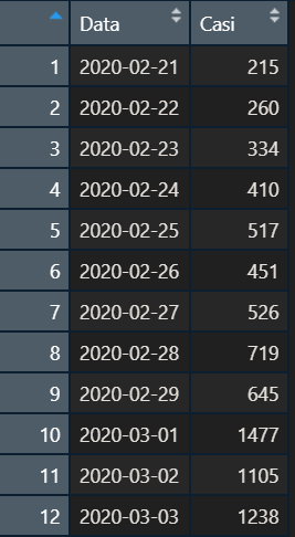 Purtroppo, però, avere una stima precisa di R(t) non è cosa semplice. Sempre idealmente, per calcolare R(t) basta una sola variabile: i nuovi contagiati di ogni giorno. L’input nel processo di calcolo sarà quindi una semplice tabella con due colonne: la data di ogni giorno e il numero di nuovi casi corrispondenti a quel giorno.