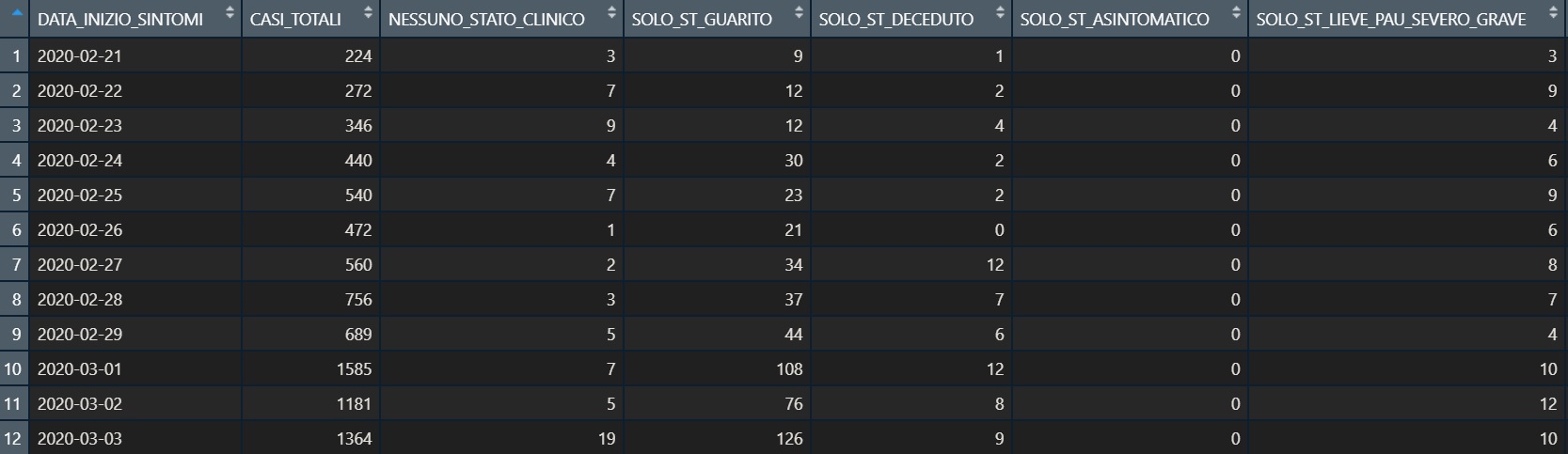 Chiarito questo, torniamo alla matrice dati trasmessa a Roma per il calcolo dell’R(t) e alziamo il livello di difficoltà: non c’è solo la colonna della data e quella dei casi che ogni giorno hanno sviluppato i sintomi. Ci sono infatti anche altre colonne che ripartiscono i casi di ogni giorno per status clinico, compresa una colonna di coloro che sono senza status clinico (quelli il cui campo è stato lasciato vuoto), una per quelli guariti e una per quelli deceduti senza mai avere avuto uno status clinico definito.