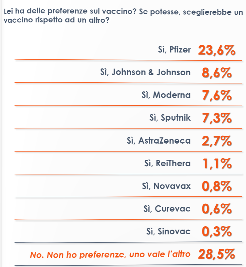Una domanda simile è stata posta anche da Euromedia Research il 9 marzo. Potendo scegliere, il 23,6% andrebbe su Pfizer, l’8,6% su Johnson & Johnson, il 7,6% su Moderna, il 7,3% su Sputnik, il 2,7% su AstraZeneca e il 2,8% su altri vaccini, mentre il 28,5% non ha preferenze particolari. Il 28,2% degli intervistati ha inoltre detto di aver “paura” a fare il vaccino, mentre il 65,3% no.