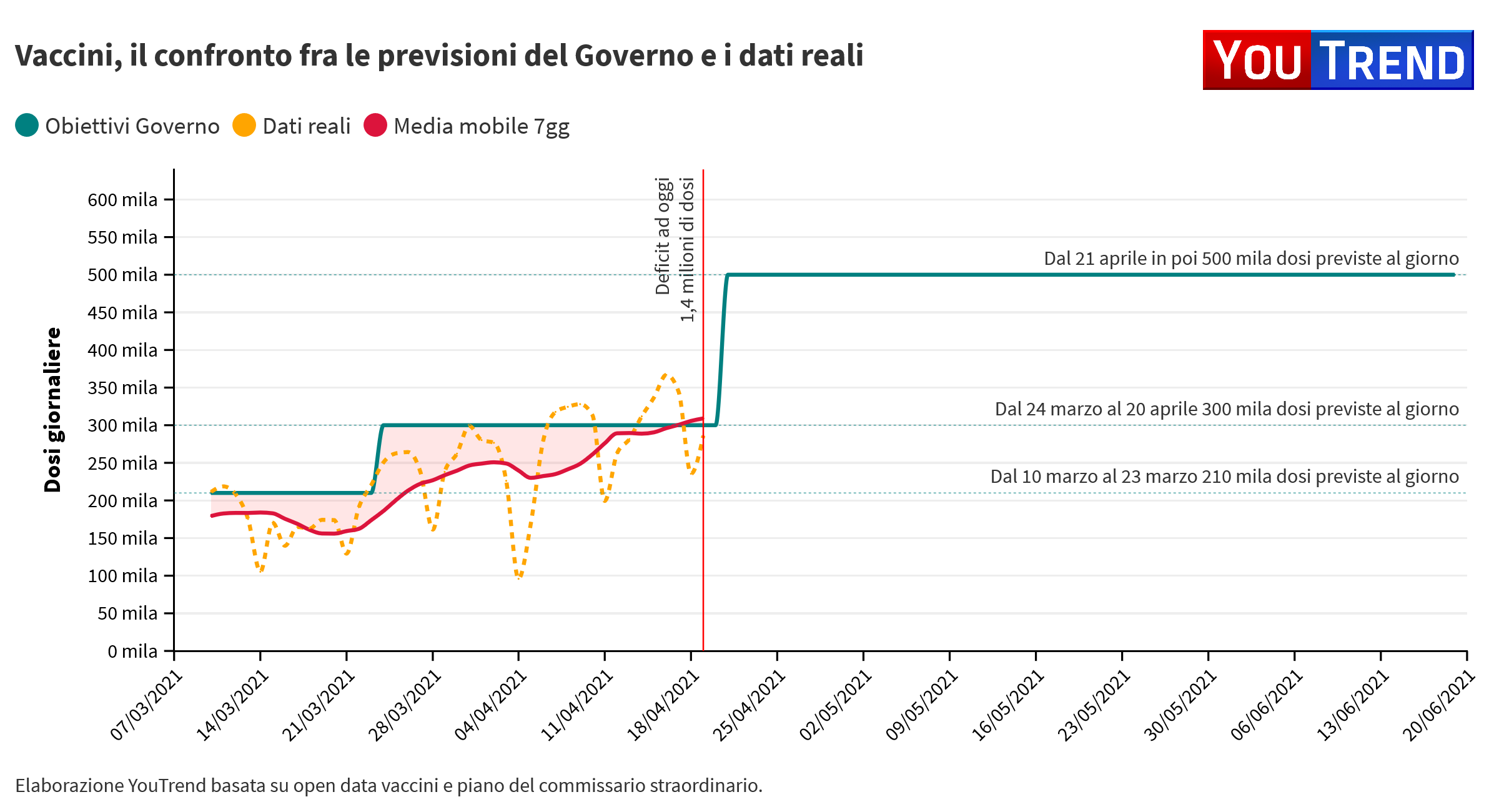 Fin da subito è stato comunque chiaro che sarebbe stato quasi impossibile rispettare il piano. Un dato su tutti: la media mobile settimanale delle somministrazioni giornaliere ha raggiunto quota 300mila per la prima volta solo il 17 aprile, quasi un mese dopo rispetto all’obiettivo prefissato.