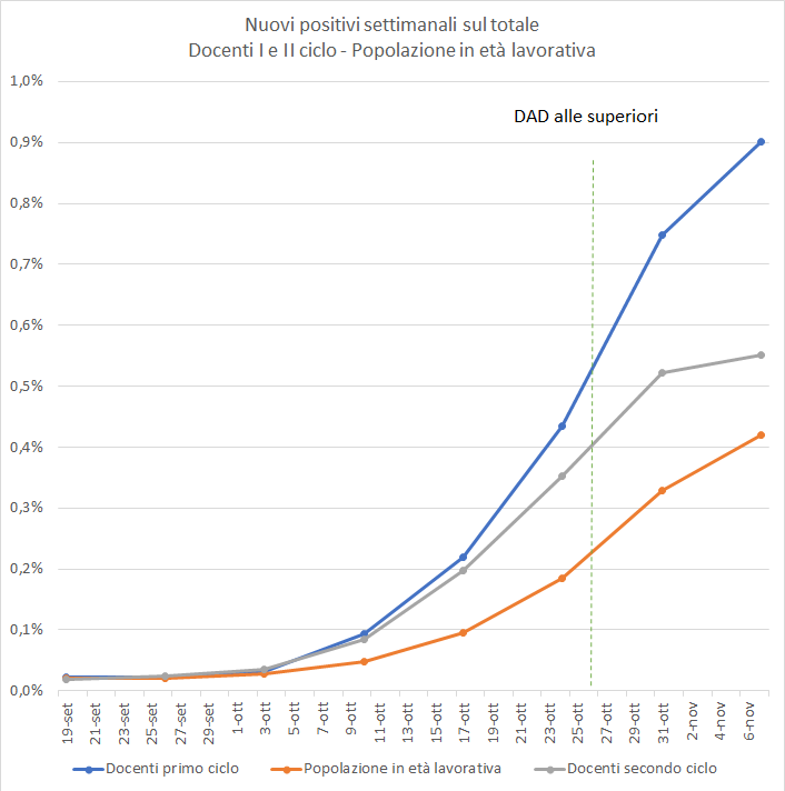 Un’altra delle criticità è l’analisi sui dati del personale docente. Il paper si focalizza su quanto succede in Veneto, ma un’analisi del fisico Alessandro Ferretti a livello nazionale e con i dati messi a disposizione dagli autori mostra come l’incidenza tra i docenti sia sensibilmente maggiore di quella della popolazione in età lavorativa e in particolar modo per quanto riguarda gli insegnanti della scuola primaria. L’incidenza tra i docenti di medie e superiori invece flette quando vi è il passaggio alla didattica a distanza in diverse regioni italiane.