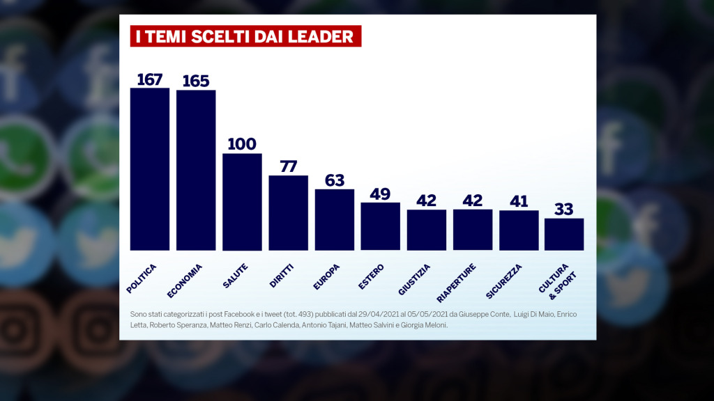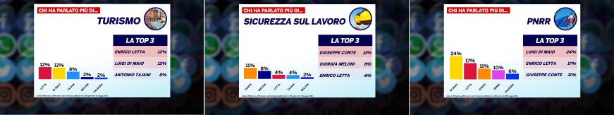 Anche se tutti i leader parlano di temi economici, non tutti lo fanno allo stesso modo. Alcuni puntano maggiormente sul rilancio del turismo, altri sul tema delle riaperture o, commentando la cronaca, sulla sicurezza sul lavoro. Questi ultimi due argomenti, ad esempio, sono stati utilizzati in modo particolare da Giorgia Meloni, mentre il dibattito sul PNRR, comunque piuttosto esiguo, viene portato avanti anche questa settimana principalmente dai partiti che sostenevano il Governo Conte II.