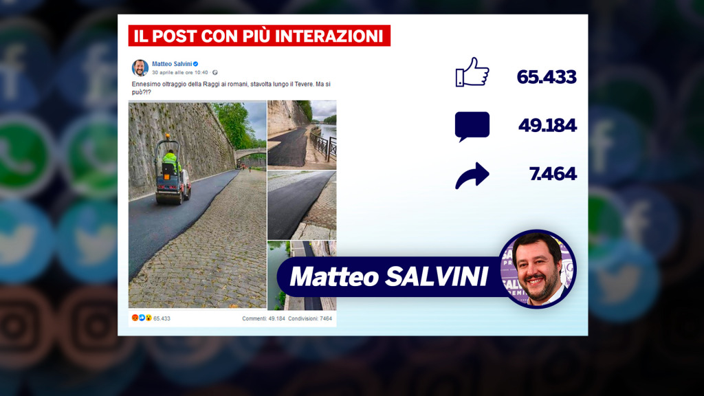 Si avvicinano le elezioni amministrative e in attesa di scoprire tutti i candidati nelle principali città che andranno al voto, la campagna si inizia ad infiammare sui social. In particolare, su Roma si registrano alcuni attacchi di Matteo Salvini e Carlo Calenda alla sindaca uscente Virginia Raggi. Entrambi, commentando i lavori della ciclabile sul lungotevere, hanno infatti realizzato il post più apprezzato dai propri utenti.