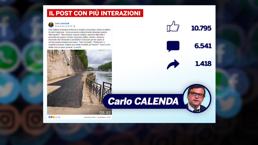 Si avvicinano le elezioni amministrative e in attesa di scoprire tutti i candidati nelle principali città che andranno al voto, la campagna si inizia ad infiammare sui social. In particolare, su Roma si registrano alcuni attacchi di Matteo Salvini e Carlo Calenda alla sindaca uscente Virginia Raggi. Entrambi, commentando i lavori della ciclabile sul lungotevere, hanno infatti realizzato il post più apprezzato dai propri utenti.