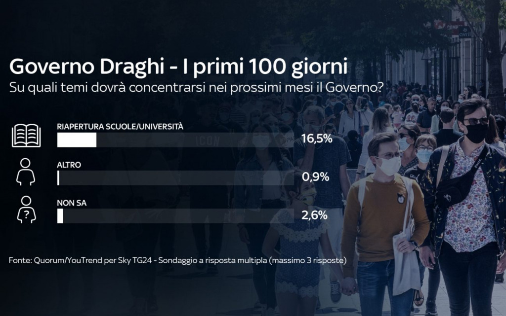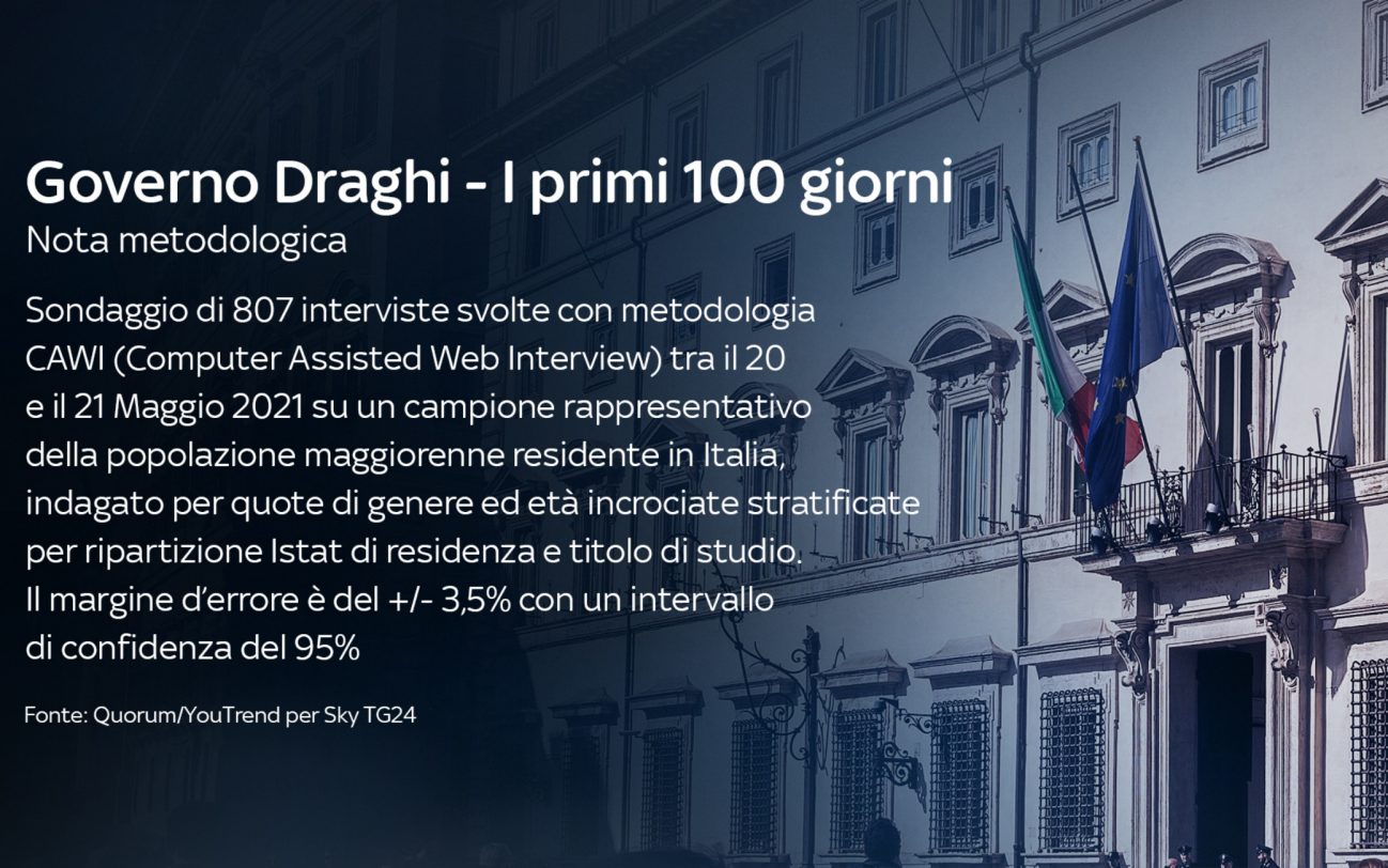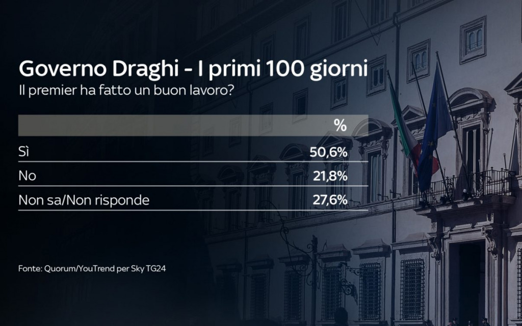 Secondo il 50.6% degli intervistati dell’ultimo sondaggio Quorum/YouTrend per Sky TG24, il Premier ha fatto un buon lavoro. Il 21,8% pensa invece il contrario, mentre il 27,6% non sa/non risponde.