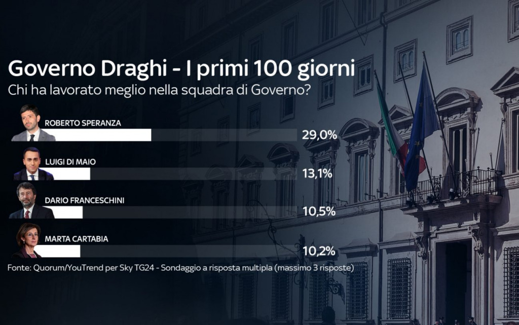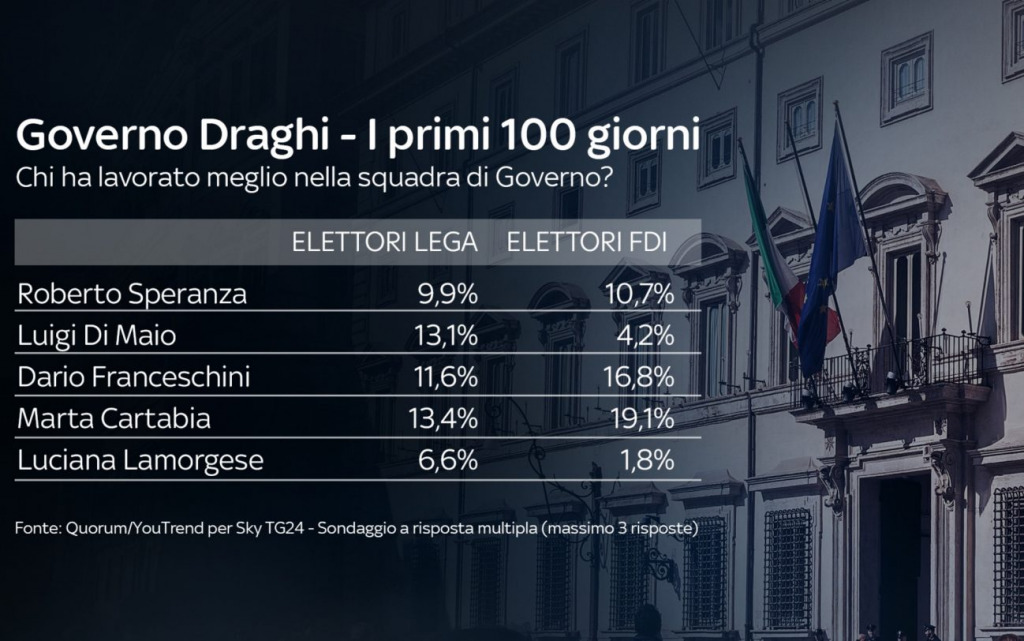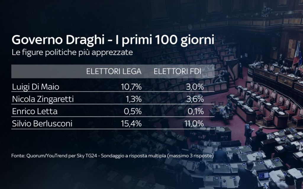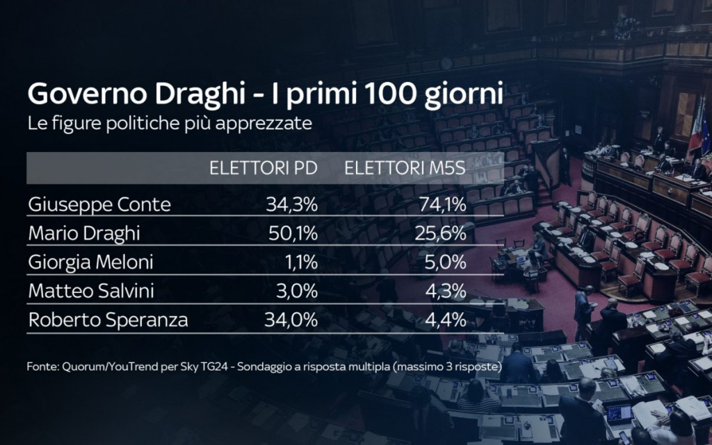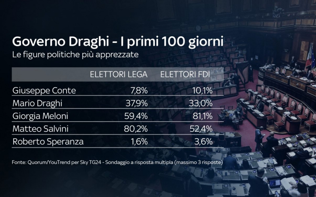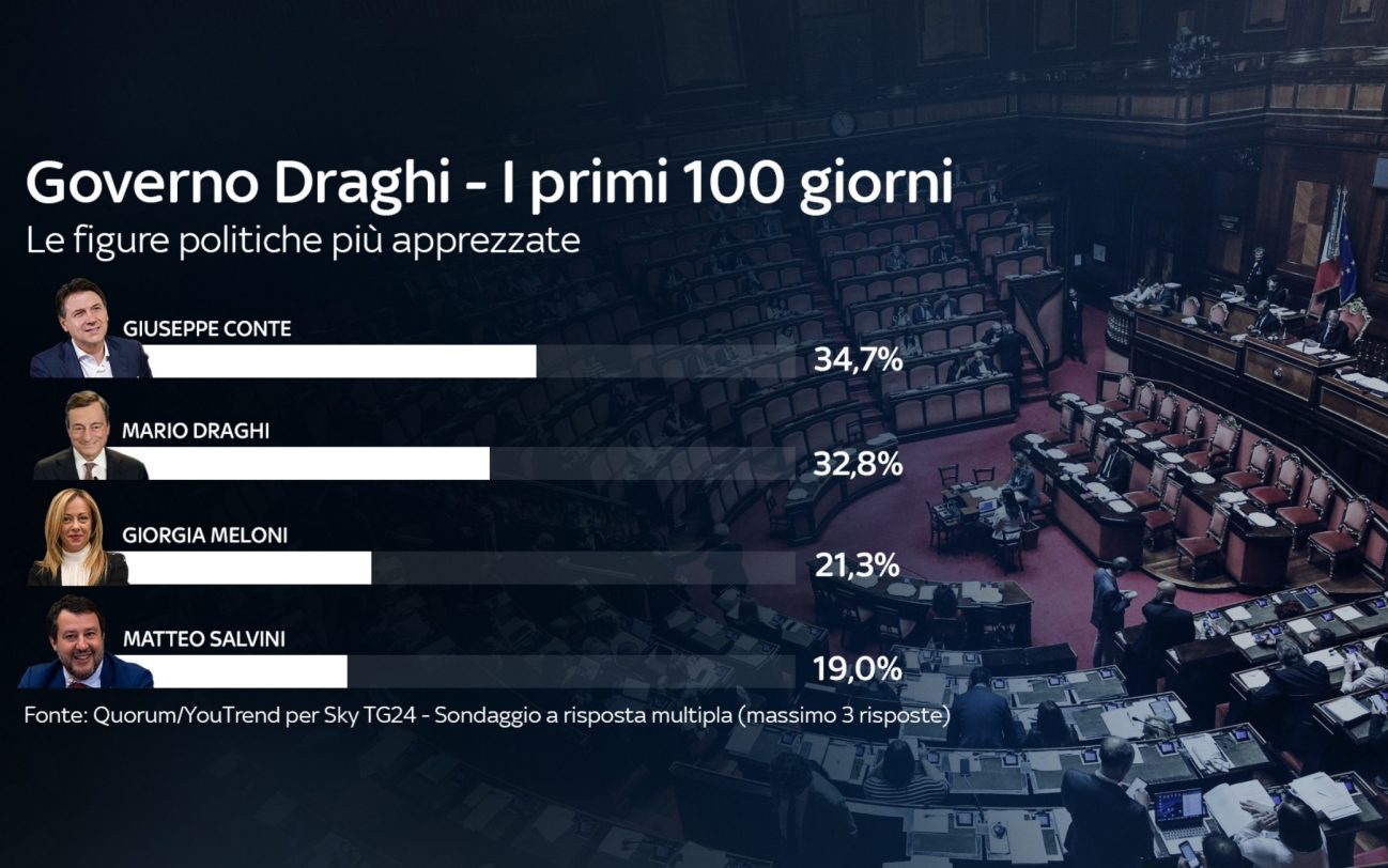 I leader politici più apprezzati in questi primi 100 giorni del Governo Draghi sono Conte (34,7%) e lo stesso Draghi (32,8%). Più indietro Meloni (21,3%) e Salvini (19%). Sotto il 15% tutti gli altri leader.