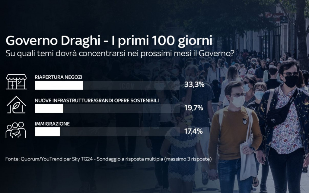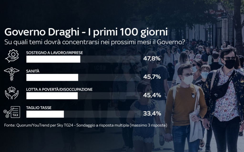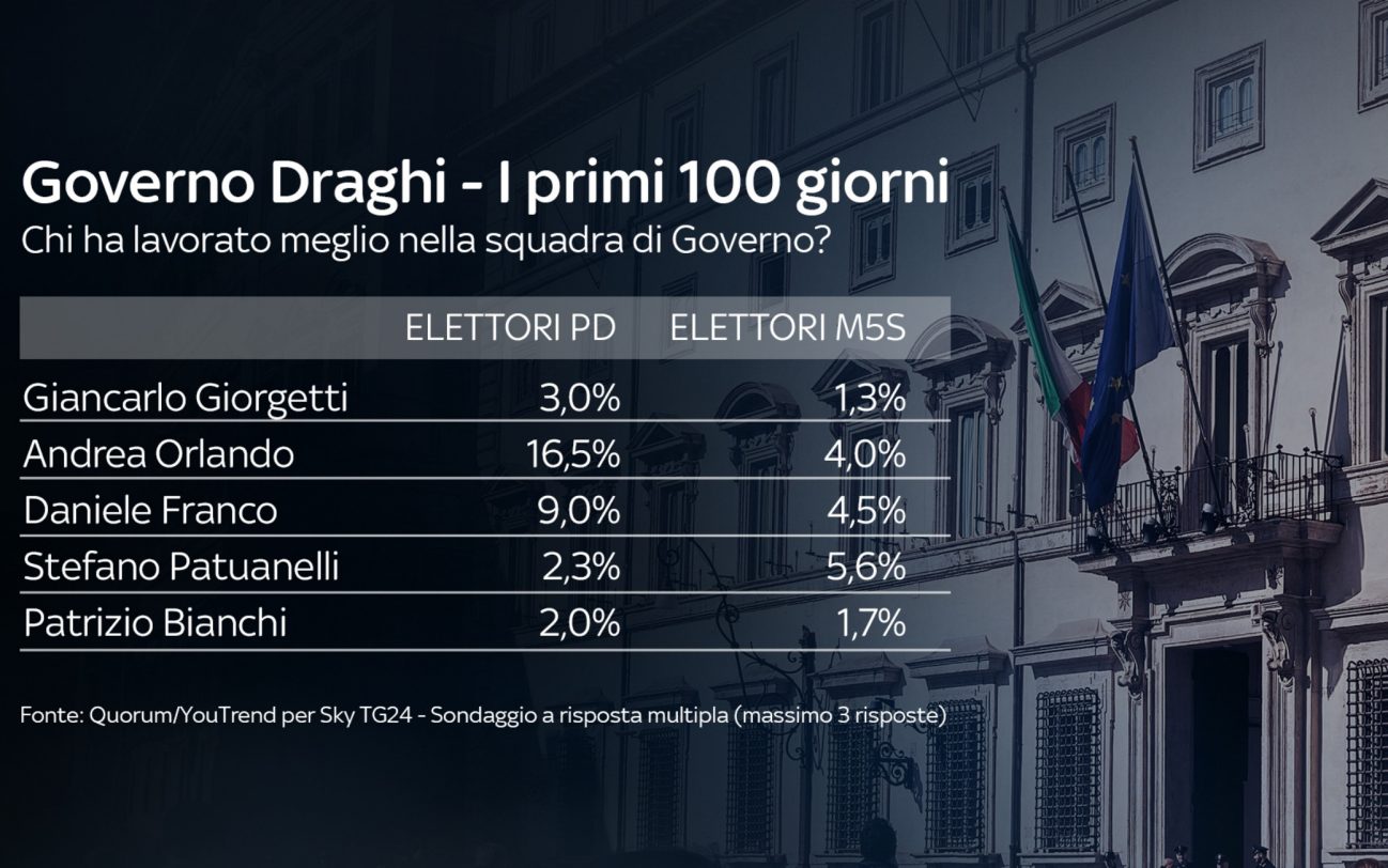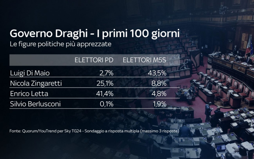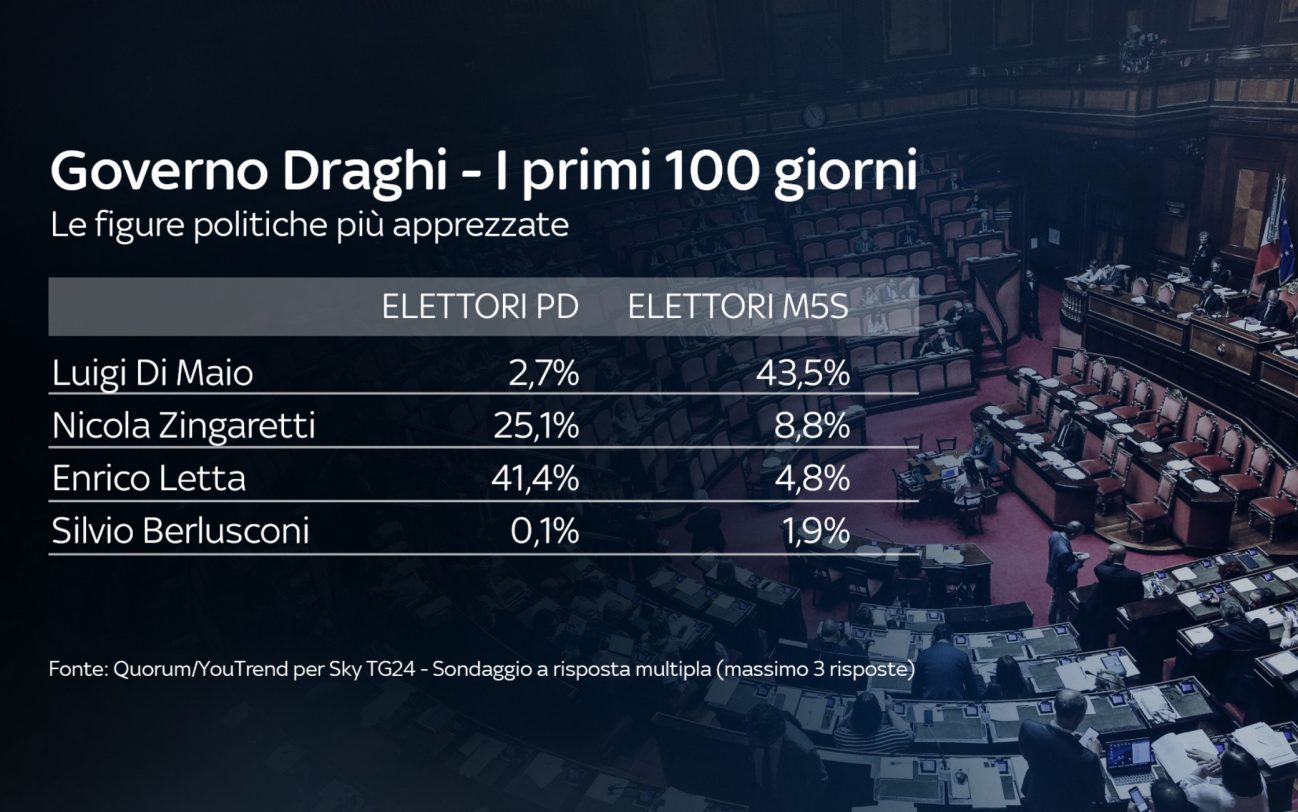 I leader politici più apprezzati in questi primi 100 giorni del Governo Draghi sono Conte (34,7%) e lo stesso Draghi (32,8%). Più indietro Meloni (21,3%) e Salvini (19%). Sotto il 15% tutti gli altri leader.