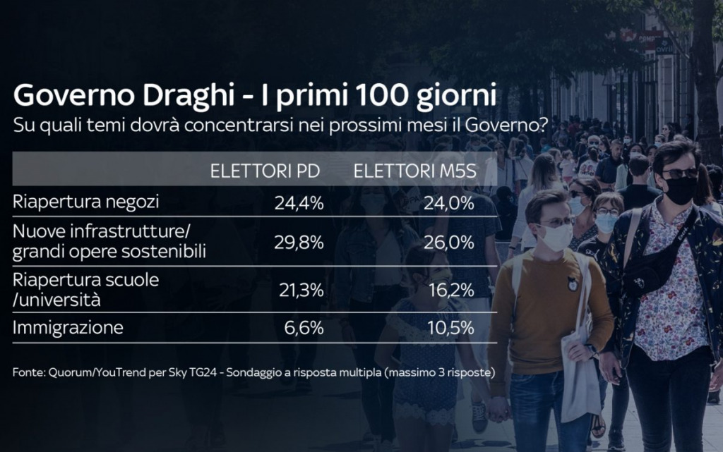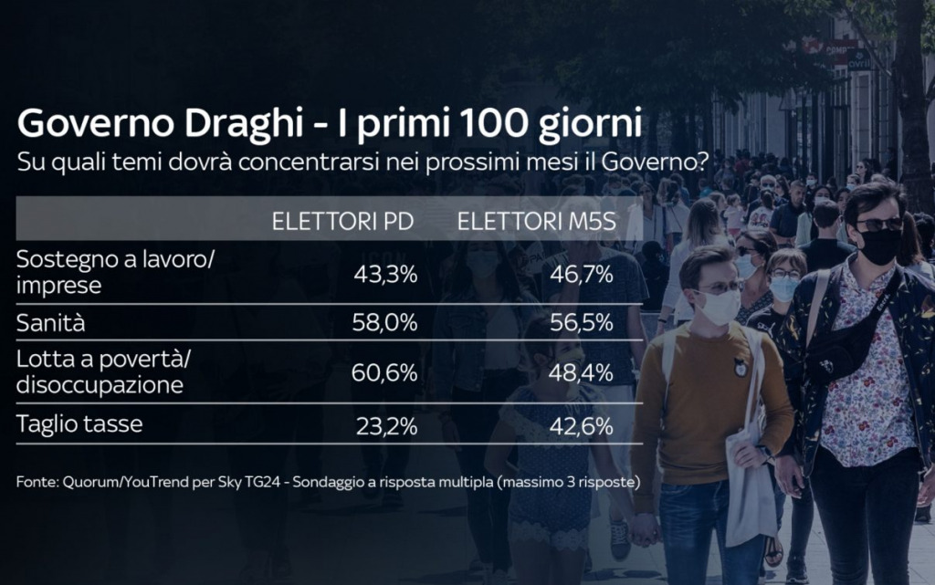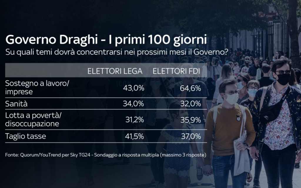 Quali sono i temi su cui dovrà concentrarsi il Governo nei prossimi mesi? Per gli italiani le priorità sono soprattutto il sostegno al lavoro e alle imprese, la sanità e la lotta a povertà e disoccupazione. Nello specifico, tra gli elettori PD il tema indicato come maggiormente prioritario per il Governo è la lotta a povertà e disoccupazione; tra chi vota M5S è invece la sanità. Gli elettori di FdI indicano invece il sostegno a lavoro e imprese, mentre per chi vota Lega il tema principale è l’immigrazione.