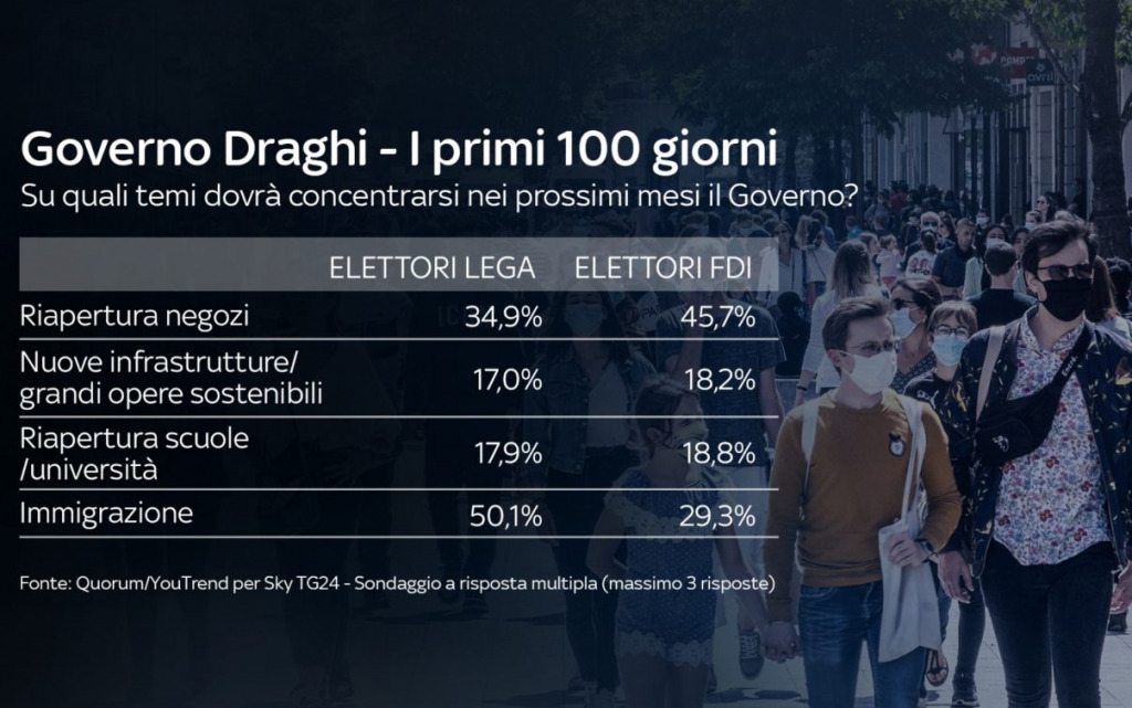 Draghi è in particolare il leader più apprezzato tra chi vota PD col 50,1%, seguito da Letta 41,4%. Tra gli elettori M5S il Premier scende al 25,6%, venendo superato da Di Maio (43,5%) e soprattutto da Conte (74,1%). Al contrario, i leader politici più apprezzati dagli elettori di Lega e FdI sono rispettivamente Salvini e Meloni. Tra questi elettorati il consenso di Draghi si attesta tra il 30 e il 40%.