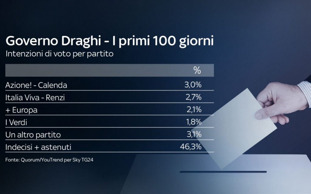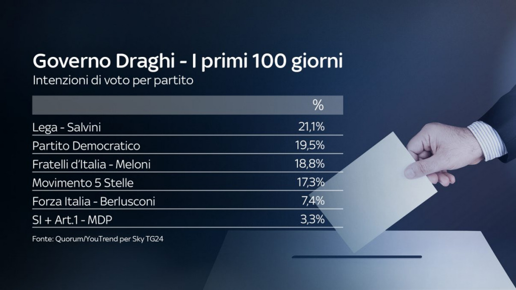 Infine, le intenzioni di voto: Lega prima col 21,1%, seguita da PD (19,5%), FdI (18,8%) e M5S (17,3%). Più indietro FI (7,4%). Sotto il 4% tutte le restanti forze politiche.
