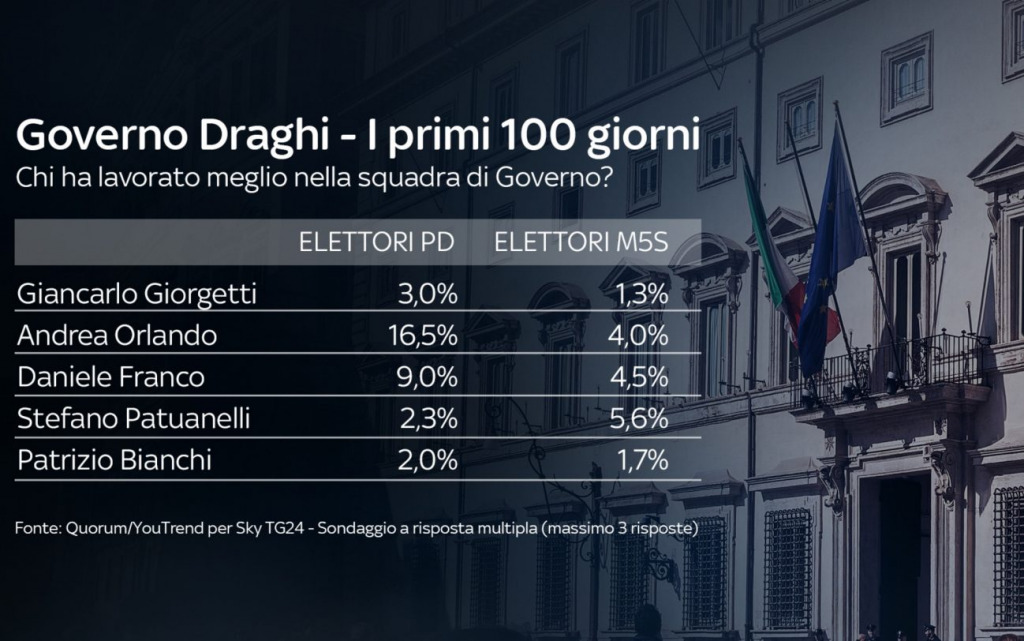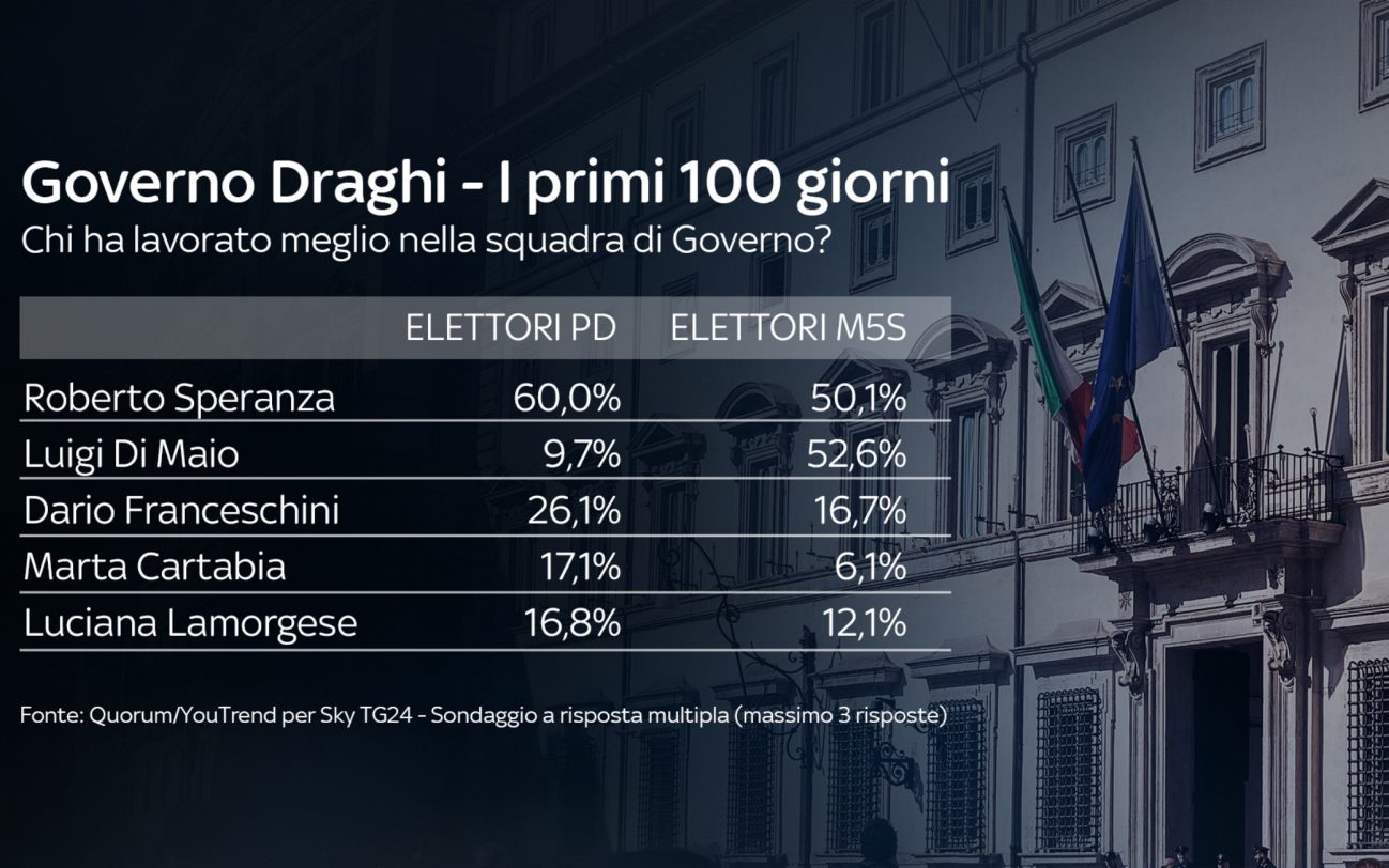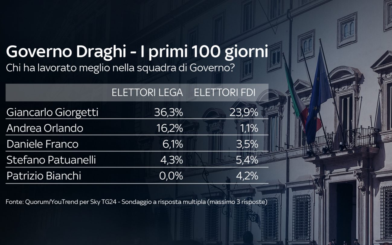 Il Ministro che ha lavorato meglio è Speranza (29%). Più indietro – ma sempre nella top 4 – troviamo, tra il 10 e il 13%, Di Maio, Franceschini e Cartabia. Tra gli elettori PD il ministro più apprezzato è sempre Speranza (60%), mentre tra gli elettori M5S è Di Maio (52,6%). Tra chi vota Lega e di FdI il ministro più apprezzato del Governo è invece Giancarlo Giorgetti (36,3%).