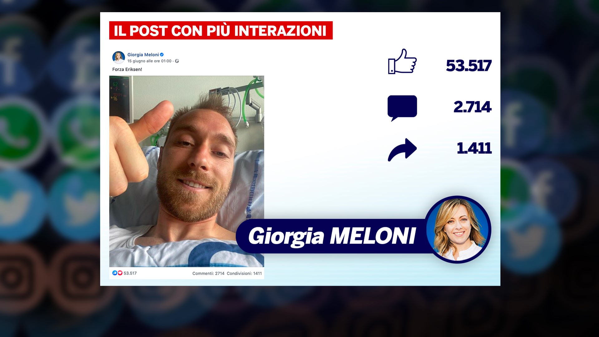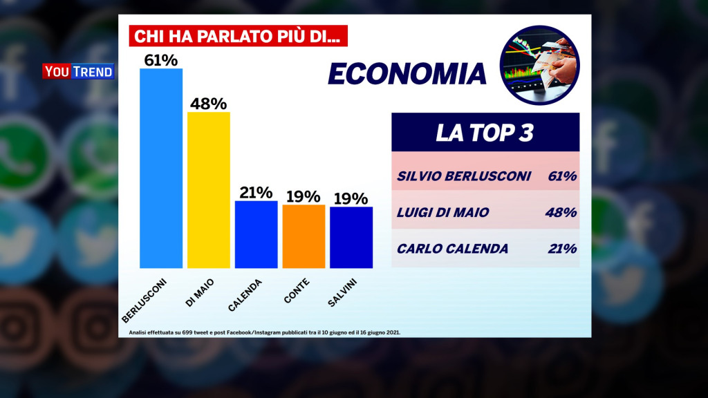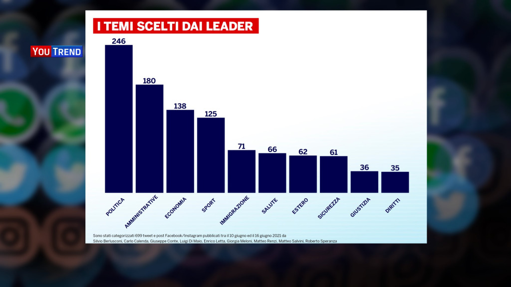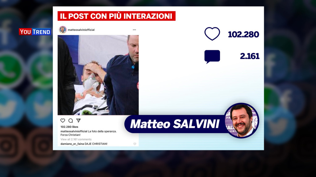 Questa è stata anche la settimana degli Europei di calcio. Tutti i leader sono intervenuti commentando le gesta della nazionale italiana e il ritorno alla normalità simboleggiato anche dalla presenza del pubblico negli stadi. Ma all’interno di questa cornice, sono stati condivisi diversi post anche su Christian Eriksen, che durante una partita della sua Danimarca ha accusato un grave malore facendo temere per la sua vita. È interessante come sia per Giorgia Meloni che per Matteo Salvini i post di auguri per lo sportivo siano stati quelli con più interazioni.