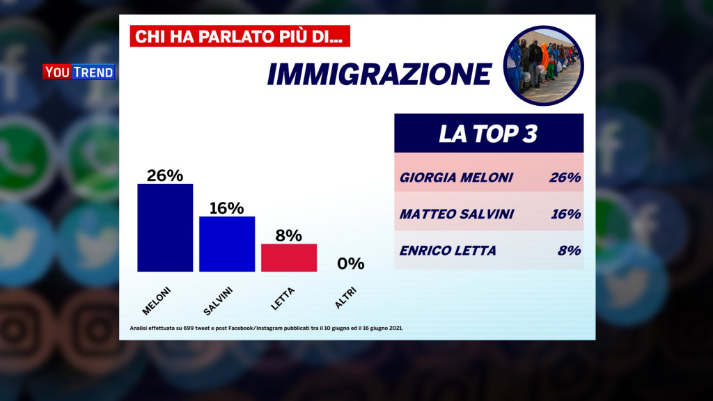Giorgia Meloni, invece, si differenzia dai due alleati di centrodestra puntando sull’immigrazione, un argomento che in generale non è stato tra i più frequenti, ma che ha prodotto una forte polarizzazione. Continuano gli stessi attacchi alla sinistra che abbiamo potuto osservare nella settimana scorsa.