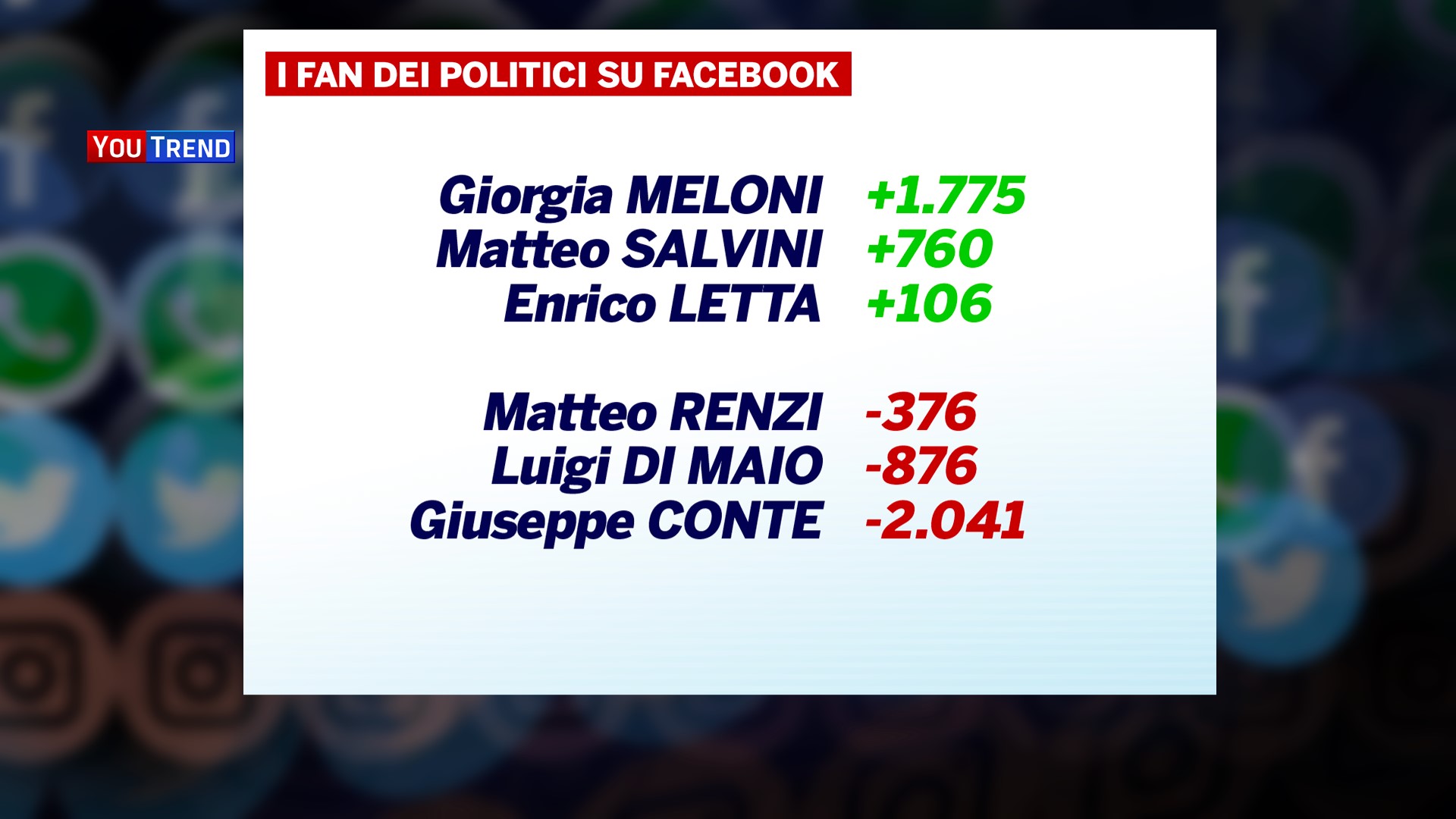 Tra agende che cambiano, temi in discesa e in salita, per i fan delle pagine Facebook si conferma anche questa settimana il solito trend con una crescita delle pagine di Giorgia Meloni, Matteo Salvini ed Enrico Letta, e una perdita di like per Matteo Renzi, Luigi Di Maio e Giuseppe Conte.