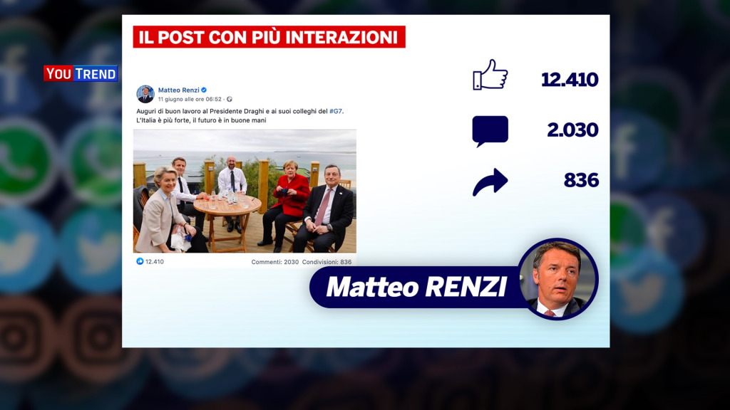 Tra i contenuti meno frequenti si possono osservare comunque delle dinamiche interessanti. Sulla salute, ad esempio, si conferma un trend discendente, ma si registra un acceso dibattito (soprattutto nel centrodestra) sulla vaccinazione dei più giovani e sulle linee guida per il vaccino AstraZeneca. Si è guardato un po’ anche fuori dai confini nazionali, commentando le vicende europee e il G7, come fatto ad esempio nel post con più interazioni di Matteo Renzi, ma soprattutto parlando di Patrick Zaki, che ha compiuto in carcere 30 anni.
