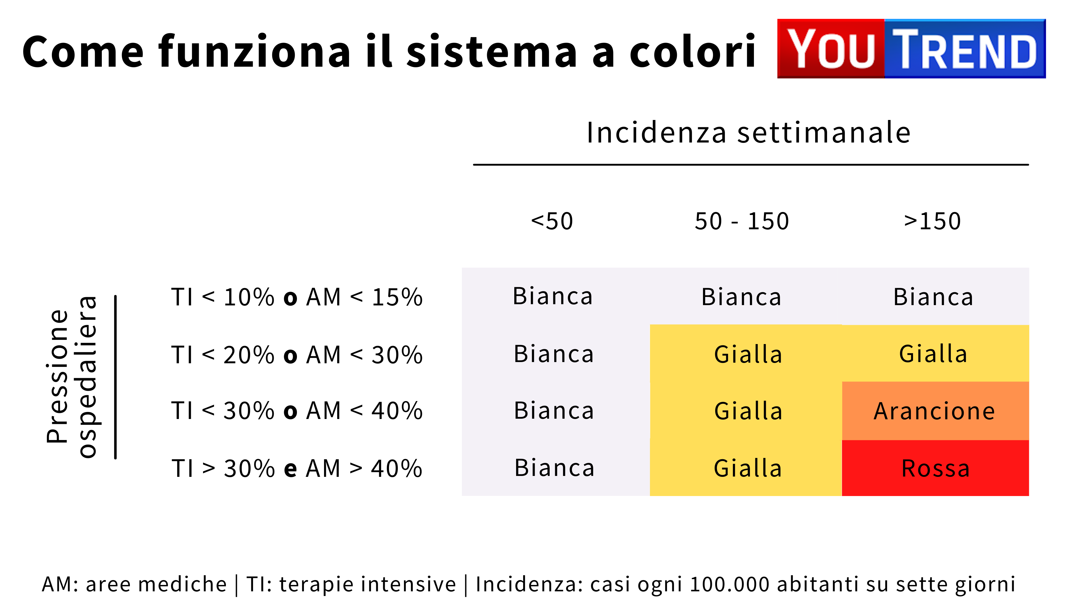 Questa modifica va a semplificare il sistema di monitoraggio precedente, eliminando l’analisi del rischio e basandosi esclusivamente sulla combinazione dell’incidenza settimanale ogni 100.000 abitanti e dell’occupazione delle terapie intensive e delle aree mediche rilevanti.