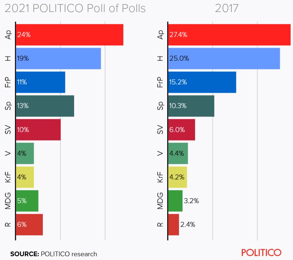 Nei sondaggi Høyre è dato attorno al 19% (anche se pochi mesi fa era attorno al 28%), mentre gli altri due partiti della maggioranza, KrF e Venstre, potrebbero addirittura non superare la soglia di sbarramento del 4%. Questo significa che, anche inglobando in un’ipotetica maggioranza i populisti del Partito del Progresso (Fremskrittspartiet o FrP, dato all’11%), in ogni caso il centro-destra non avrebbe i numeri per governare.