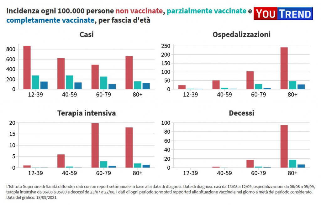 Nel periodo tra il 13 agosto e il 12 settembre, ad esempio, nelle persone tra 40 e 59 anni ci sono state 623 diagnosi ogni 100.000 persone non vaccinate, 275 ogni 100.000 parzialmente vaccinate e 134 ogni 100.000 individui completamente vaccinati. Questi dati mostrano quindi che la riduzione delle diagnosi tra i vaccinati rispetto ai non vaccinati è stata del 56% per coloro che erano parzialmente vaccinati e del 79% tra chi aveva completato il ciclo vaccinale. I dati sulle diagnosi vanno comunque presi con cautela, in quanto sono influenzati dalle strategia di testing adottata nel èaese: in Italia, nello specifico, le persone che non intendono vaccinarsi ma desiderano avere il Green pass sono costrette a effettuare un numero di tamponi molto maggiore rispetto ai vaccinati.