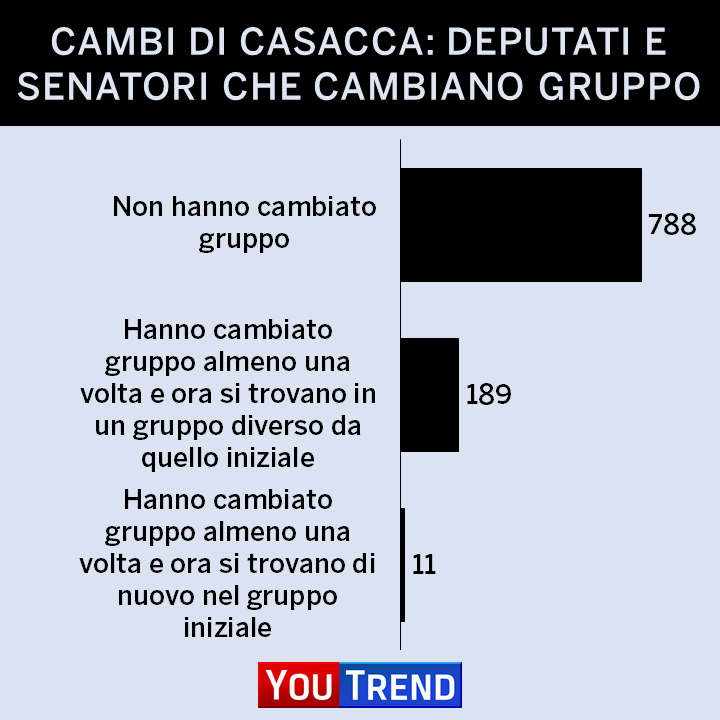 Come detto, fino a questo momento della legislatura 200 parlamentari su 988 hanno cambiato schieramento almeno una volta. Di questi, 11 sono poi ritornati nel loro gruppo di origine, mentre 189 ora si trovano in un gruppo diverso da quello di partenza.