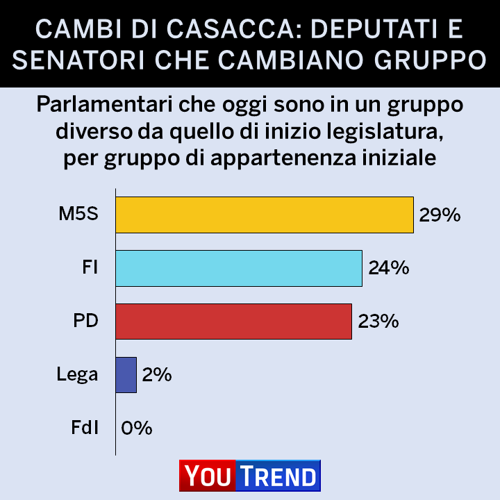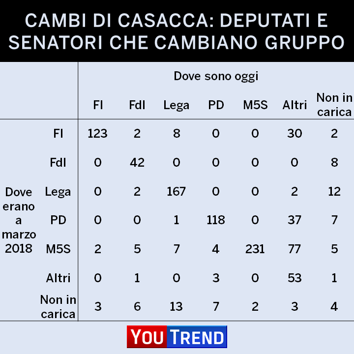 FI ha invece perso il 24% dei parlamentari eletti a marzo 2018 (soprattutto in direzione di Coraggio Italia) e il PD il 23% (soprattutto in direzione di Italia Viva).