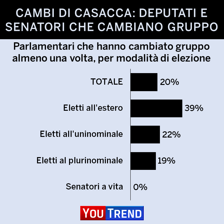 Nello specifico, 7 dei 18 parlamentari eletti all’estero hanno cambiato gruppo almeno una volta in questa legislatura. Tra gli eletti nei collegi uninominali il dato è al 22% (79 su 359) e tra gli eletti nei plurinominali è al 19% (114 su 605). Nessuno dei 6 senatori a vita ha invece cambiato gruppo.