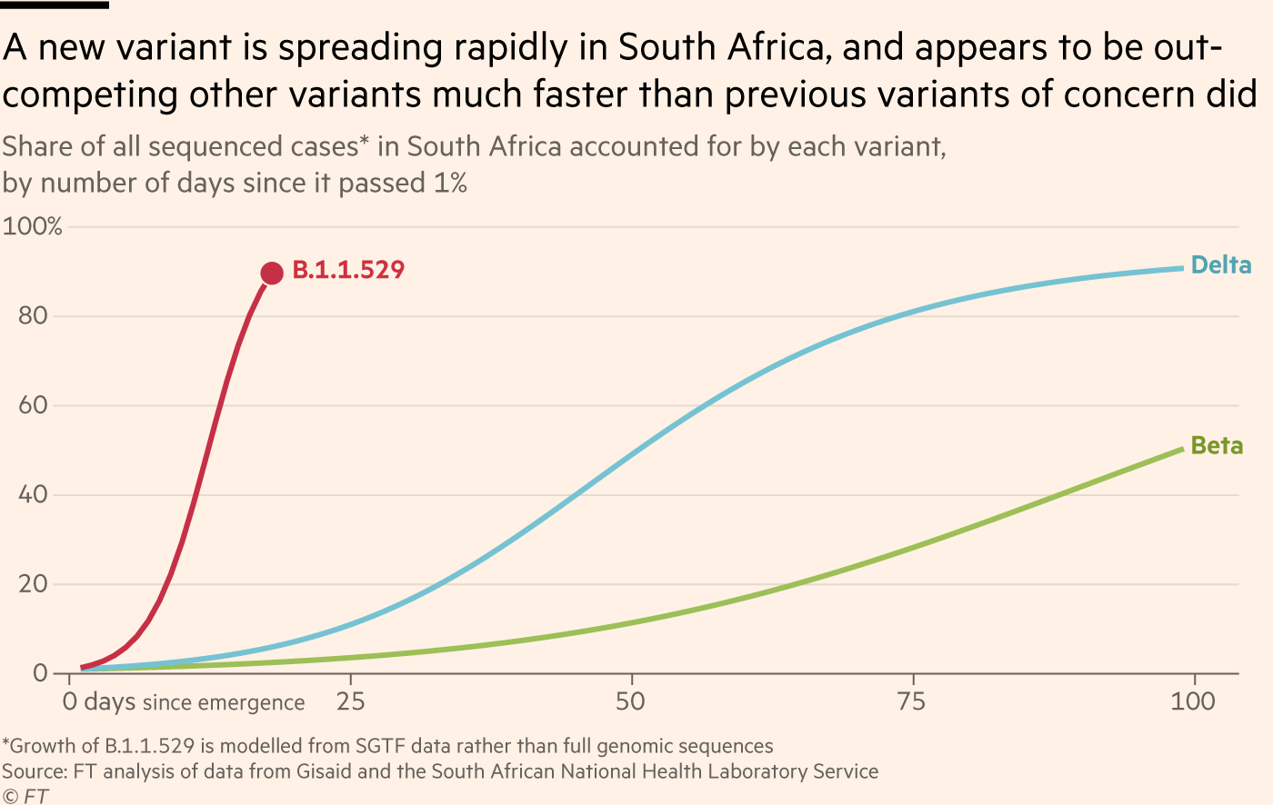 Trevor Bedford, un noto epidemiologo matematico, ha spiegato perché le mutazioni di Omicron preoccupano così tanto. Il motivo, come mostra il grafico, è il grande salto che ha fatto Omicron rispetto alle altre varianti: Bedford, basandosi sui dati preliminari, ha stimato che il tempo medio di raddoppio è di 4,8 giorni e che il tasso di crescita in relazione a Delta non è ancora chiaro, ma crede che “stiamo osservando una variante che potenzialmente ha una significativa evasione immunitaria e che sembra diffondersi rapidamente”.