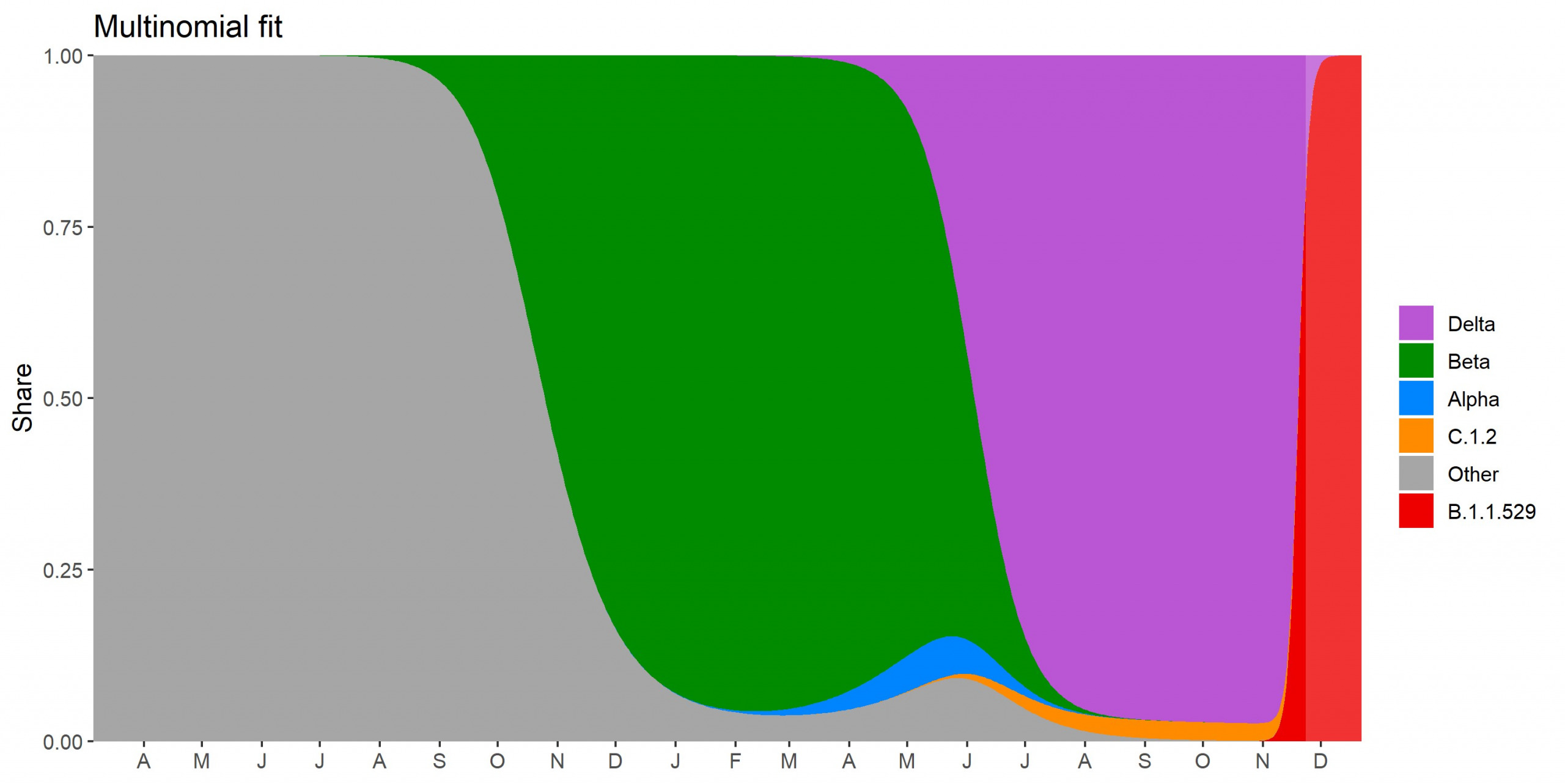 Un’analisi condotta dal professore di biostatistica Tom Wenseleers con un modello multinomiale mostra che Omicron avrebbe un vantaggio di crescita del 38% al giorno su Delta in Sudafrica e, considerando un tempo di generazione di 4,7 giorni, vorrebbe dire che si trasmette sei volte più velocemente di Delta. Wenseleers scrive che i dati vanno ancora confermati, ma osserva anche come per passare dallo 0,1% al 50% di prevalenza ci abbia messo solo due settimane, mentre Delta impiegò mesi. Va comunque considerato che queste stime si basano su piccoli numeri e che ci sono molti potenziali fattori confondenti che potrebbero portare ad avere un’immagine distorta di quello che sta accadendo.