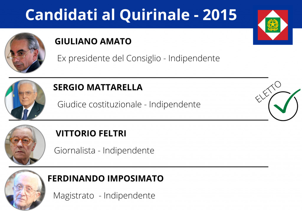 Nell’aprile 2013 la visibilità mediatica di Napolitano (32 citazioni) era data tutta dal ruolo istituzionale di presidente della Repubblica uscente più che dall’ipotesi – poi realizzatasi – di rielezione al Colle. Il nome del candidato della maggioranza, Franco Marini, rimase nell’ombra fino all’ultimo (10 citazioni) ma ciò non fu sufficiente dal metterlo a riparo dall’attacco dei “franchi tiratori” che affondarono la sua candidatura al primo scrutinio. La visibilità andò in parte alla giornalista Milena Gabanelli e al costituzionalista Stefano Rodotà, i due nomi più votati nelle “Quirinarie” online del Movimento 5 Stelle. Nel gennaio 2015 il candidato di cui si parlò maggiormente era Giuliano Amato (14 citazioni): il giudice della Corte Costituzionale sarebbe stato il nome della trattativa tra Matteo Renzi e Silvio Berlusconi come parte del “Patto del Nazareno”. Ma all’ultimo Renzi – kingmaker di quell’elezione – puntò su Sergio Mattarella, nome che fino a poco tempo prima circolava poco (10 citazioni).