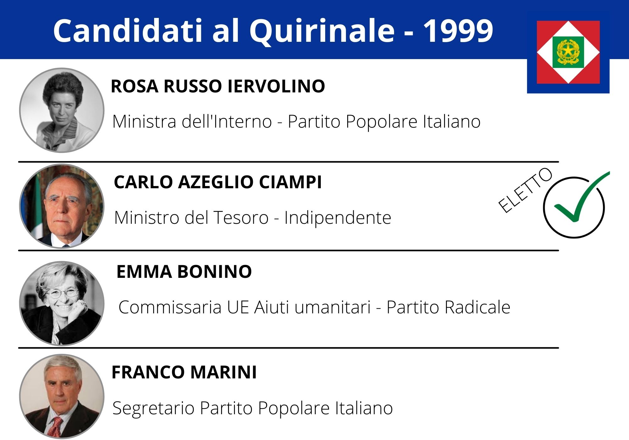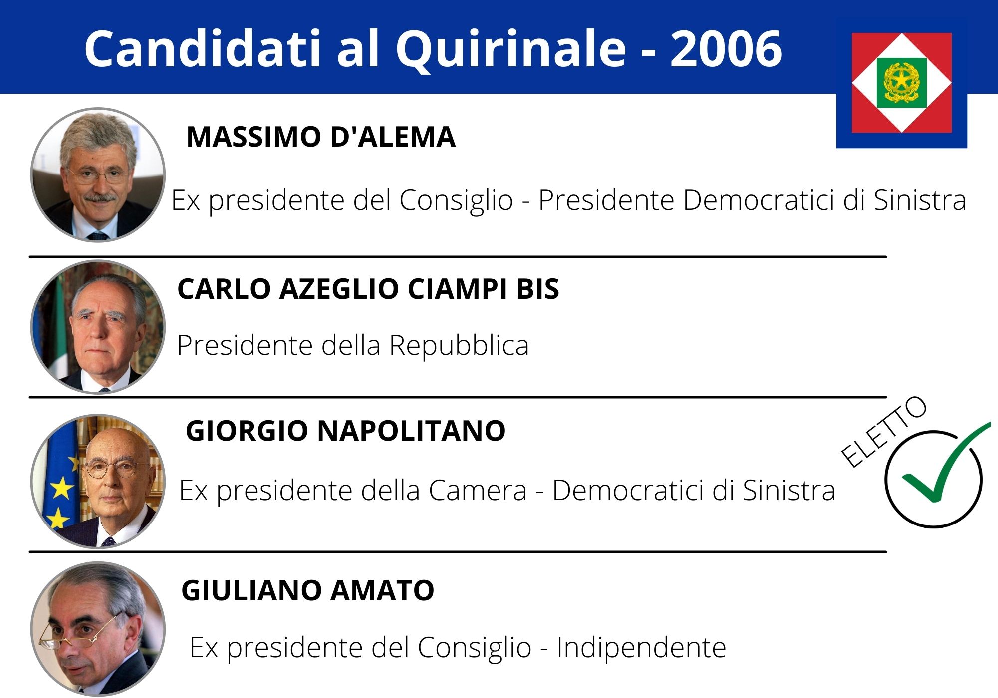 Per ogni elezione l’analisi ha conteggiato il numero di citazioni dei nomi che circolavano maggiormente sui giornali nella settimana precedente il voto. Nel 1999, ad esempio, Carlo Azeglio Ciampi – eletto al primo scrutinio – risultò di gran lunga il candidato più visibile: 92 citazioni contro le 63 di Rosa Russo Jervolino. Entrambi ricoprivano ruoli importanti – rispettivamente di ministro del Tesoro e dell’Interno nel governo D’Alema I – e questo li rese più visibili di altri “quirinabili” come Emma Bonino, che all’epoca era commissaria UE per gli Affari Sociali, o Franco Marini, leader del Partito Popolare Italiano. Nonostante il sostegno del comitato “Emma for President”, la leader radicale non guadagnò la scena mediatica. Nel maggio 2006 invece, il candidato al Colle più visibile risultò Massimo d’Alema (118 citazioni), che però era in corsa non solo per il Quirinale ma anche per la presidenza della Camera e un ministero di peso nel nascente governo Prodi II. La maggioranza trovò poi l’accordo sul nome dell’ex presidente della Camera Giorgio Napolitano che per tutta la settimana precedente ebbe “solo” 28 citazioni.
