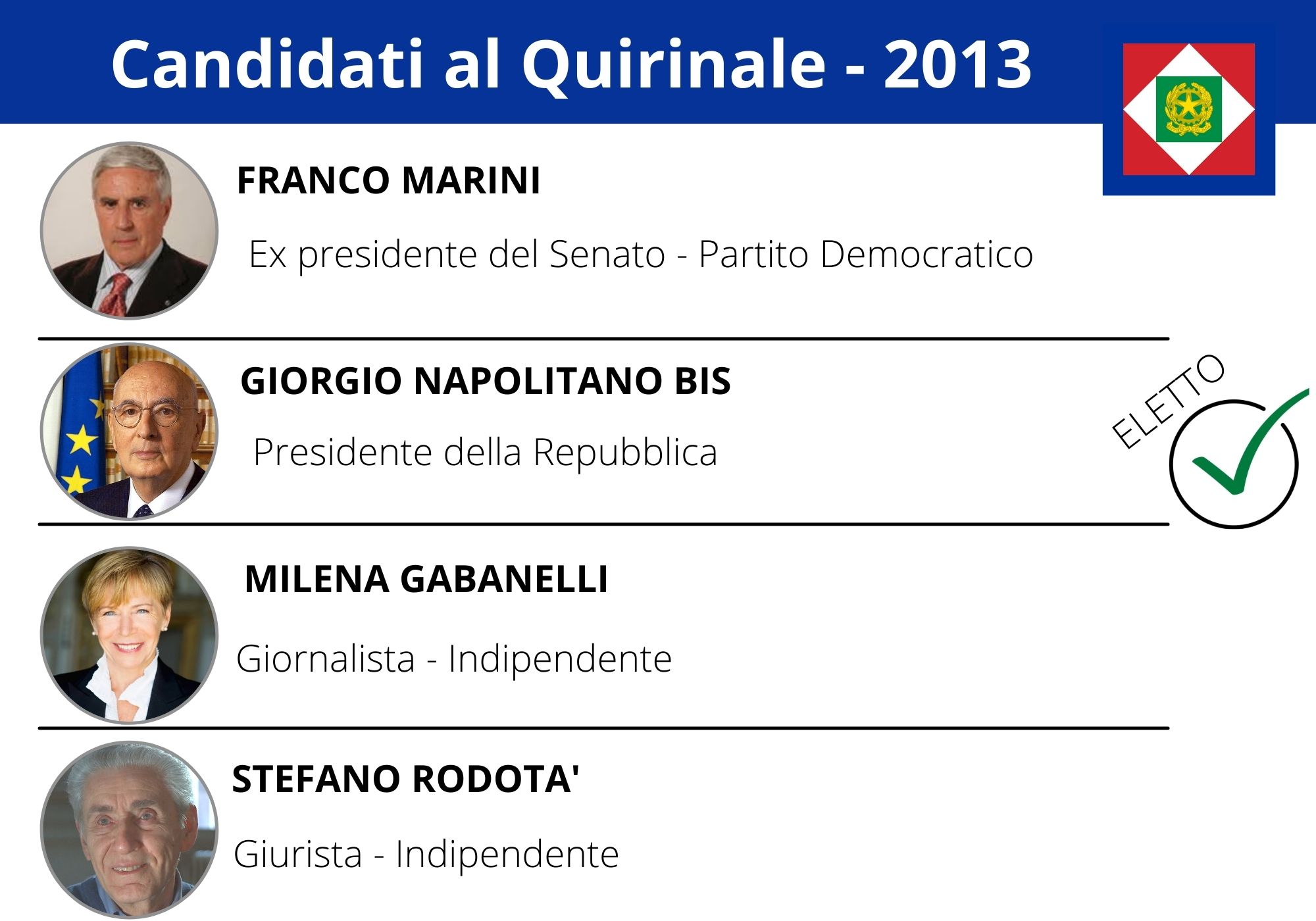 Nell’aprile 2013 la visibilità mediatica di Napolitano (32 citazioni) era data tutta dal ruolo istituzionale di presidente della Repubblica uscente più che dall’ipotesi – poi realizzatasi – di rielezione al Colle. Il nome del candidato della maggioranza, Franco Marini, rimase nell’ombra fino all’ultimo (10 citazioni) ma ciò non fu sufficiente dal metterlo a riparo dall’attacco dei “franchi tiratori” che affondarono la sua candidatura al primo scrutinio. La visibilità andò in parte alla giornalista Milena Gabanelli e al costituzionalista Stefano Rodotà, i due nomi più votati nelle “Quirinarie” online del Movimento 5 Stelle. Nel gennaio 2015 il candidato di cui si parlò maggiormente era Giuliano Amato (14 citazioni): il giudice della Corte Costituzionale sarebbe stato il nome della trattativa tra Matteo Renzi e Silvio Berlusconi come parte del “Patto del Nazareno”. Ma all’ultimo Renzi – kingmaker di quell’elezione – puntò su Sergio Mattarella, nome che fino a poco tempo prima circolava poco (10 citazioni).