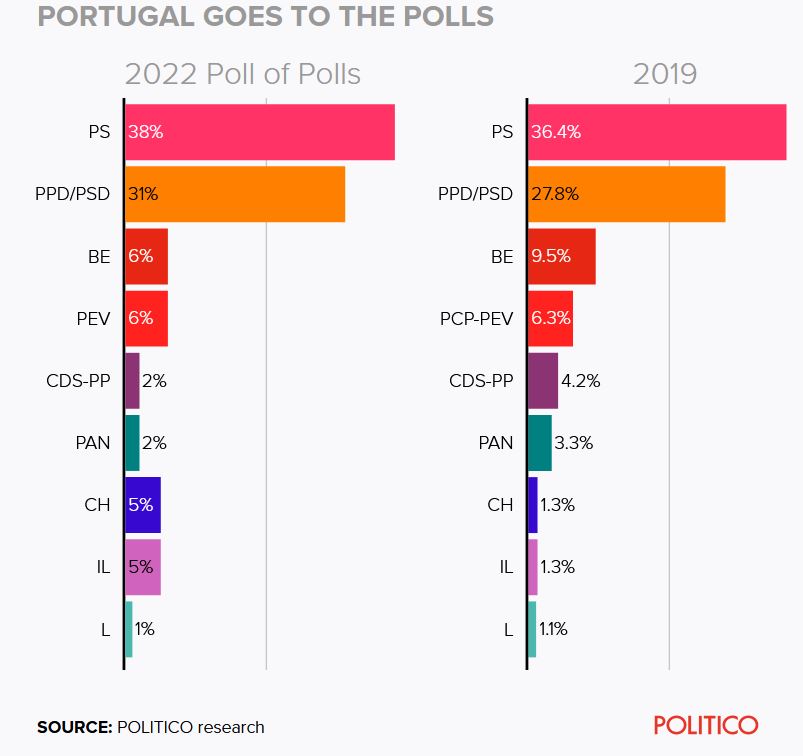 A meno di un mese dal voto, i sondaggi indicano una situazione di incertezza. Stando alla media di Politico, il Partido Socialista di Costa resta saldamente primo con il 38%, ossia circa sugli stessi livelli del 2019, quando ottenne il 36,3%. La maggioranza assoluta è vicina, ma il rischio che si ripresenti lo scenario delle elezioni precedenti – quando il PS non la raggiunse per soli 10 seggi, dovendo nuovamente fare ricorso all’appoggio di BE e PCP-PEV – è più che concreto e Costa vuole evitarlo a tutti i costi: per farlo ha presentato un programma ambizioso che punta a sottrarre voti proprio ai partiti alla sua sinistra, prevedendo l’innalzamento del salario minimo a 900 euro entro il 2026 e la riduzione della settimana lavorativa a 4 giorni.