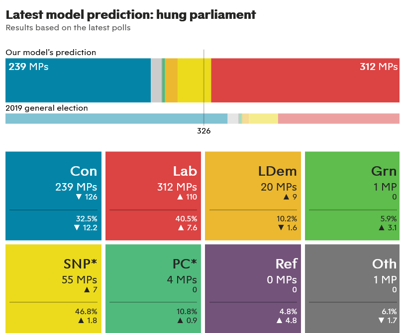 Il vantaggio permetterebbe ai Laburisti di sgretolare l’ampia maggioranza che oggi i Tories hanno in parlamento, ma difficilmente consentirebbe al partito di Keir Starmer di instaurare una nuova maggioranza autonoma, a meno di non stringere alleanze post elettorali con – ad esempio – lo Scottish National Party. Secondo Britain Predicts, ad esempio, con un vantaggio di 8 punti nelle urne, i laburisti otterrebbero 312 seggi, 14 in meno di quelli necessari per avere la maggioranza assoluta.