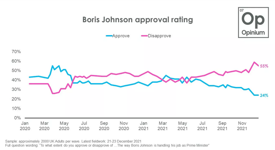 Secondo l’ultimo sondaggio di Opinium, pubblicato lo scorso week end, solo il 24% approva il modo in cui Boris Johnson sta guidando il paese, a fronte di un 58% di pareri negativi (risultato netto, -34%). Per fare un confronto, a metà gennaio 2021, mentre il Regno Unito raggiungeva il picco di morti giornalieri per Covid e il premier stata attraversando un altro periodo difficile in termini di consensi, il gradimento netto era -15%.