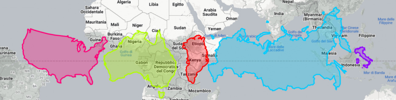 Se si sono sempre viste mappe che adottano la proiezione di Mercatore si può avere un’idea sbagliata di quanto siano grandi gli Stati, trattandosi di una rappresentazione che distorce moltissimo le dimensioni e le distanze man mano che ci si avvicina ai due poli: un Paese posto a nord, in sintesi, sembrerà molto più grande di uno posto all’equatore.