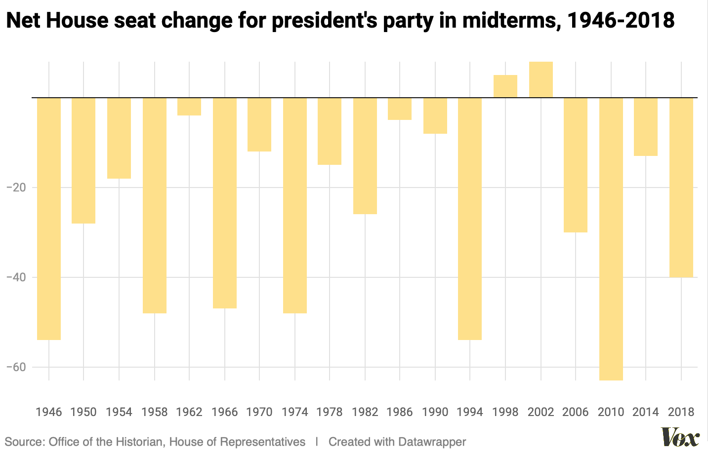 Confrontando i risultati delle elezioni di metà mandato rispetto alle presidenziali di due anni prima, si vede come in media dal secondo dopoguerra al 2018 il partito del presidente abbia perso in media tra i 17 e i 19 seggi alla Camera. A volte il calo di seggi è molto importante: furono 54 nel 1994 e 63 nel 2010. Ci sono state solo due eccezioni: nel 1998 (quando i Dem guadagnarono cinque seggi) e il 2002 (quando i Repubblicani guadagnarono otto seggi, ma questo è un caso molto a sé dovuto al fatto che, dopo l’11 settembre 2001, la popolarità del presidente Bush era a un livello estremamente alto).