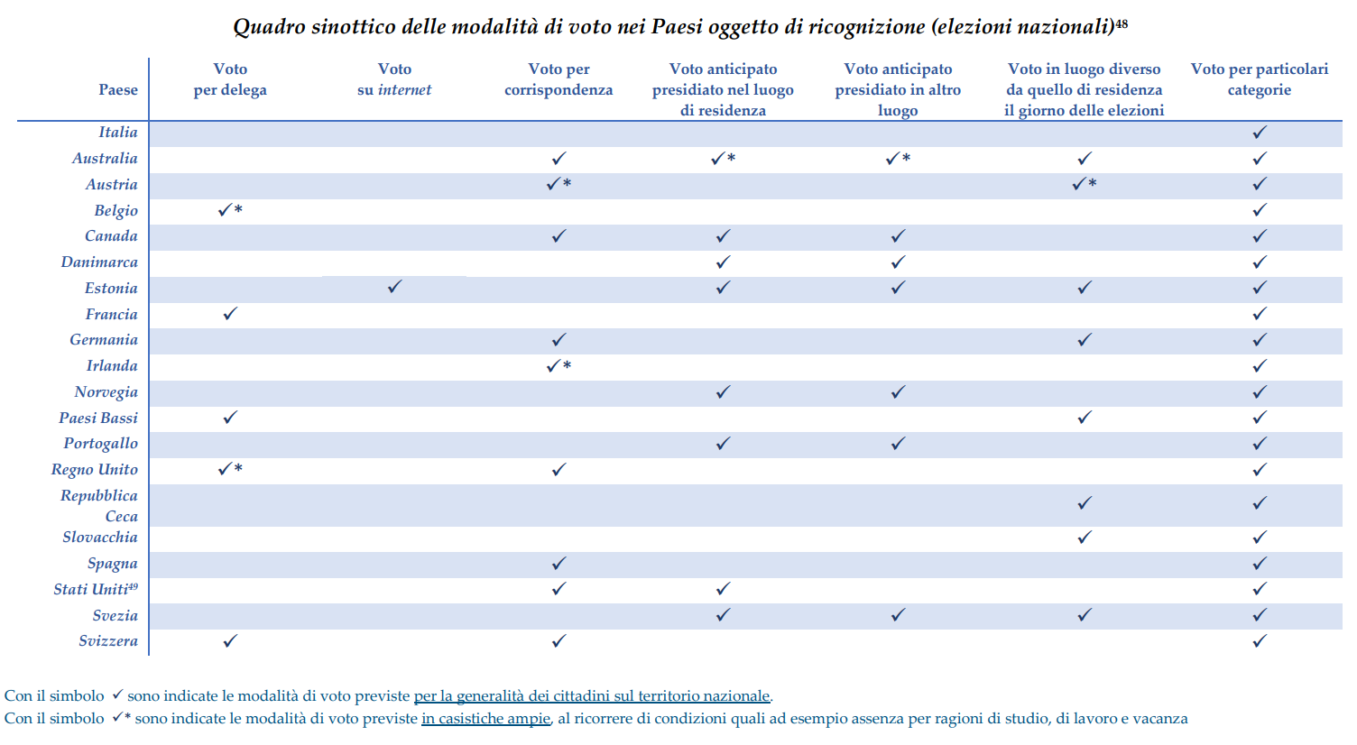Un altro modo consiste nel permettere il voto anticipato nel luogo di residenza o in altro luogo, come previsto in nove di questi paesi (Australia, Belgio, Canada, Danimarca, Estonia, Norvegia, Portogallo, Stati Uniti, Svezia): questa possibilità è riconosciuta alla generalità degli elettori − in alcuni casi previa richiesta o comunicazione − ad eccezione dell’Australia, dove invece è permesso solo in determinate circostanze.
