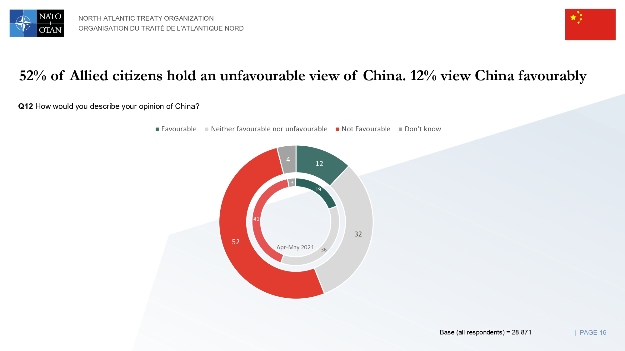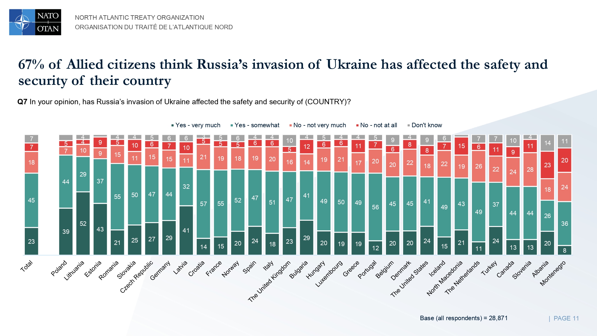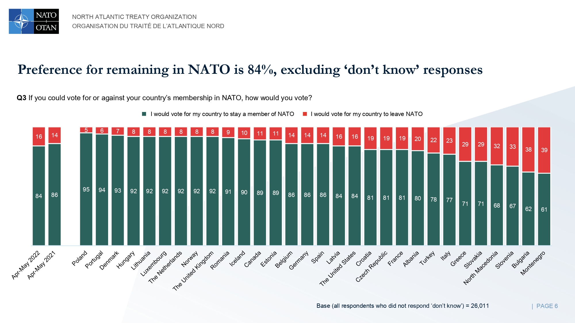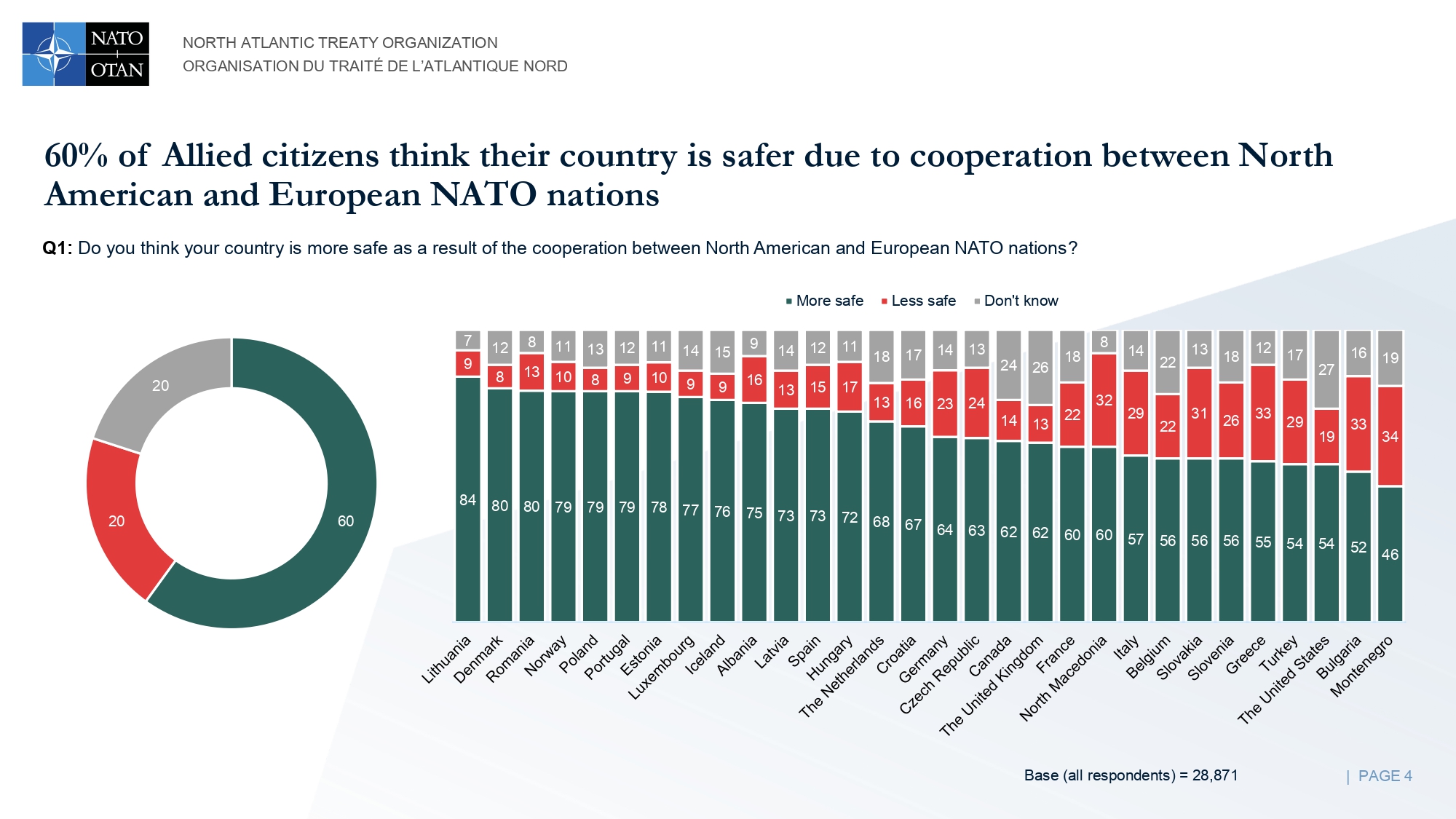 In tema di cooperazione tra l’America del Nord e i paesi europei, il 60% degli intervistati ritiene che il proprio Stato sia più sicuro grazie a ciò. I tre paesi che si sentono più sicuri grazie a questa cooperazione sono Lituania, Danimarca e Romania, mentre Stati Uniti, Bulgaria e Montenegro sono quelli che si sentono meno sicuri.