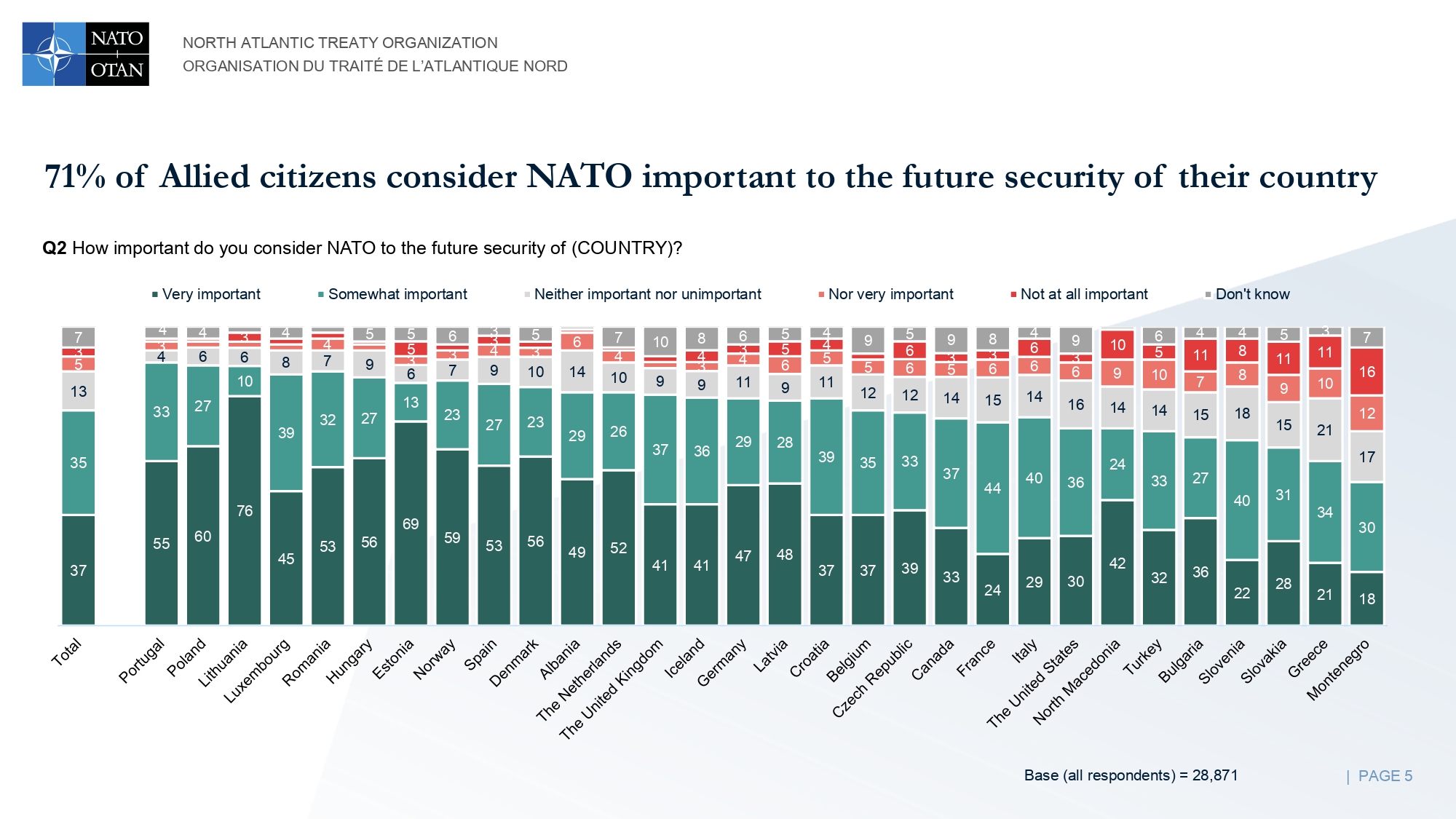 Alla domanda su quanto la NATO sia considerata importante per la sicurezza del proprio Stato, il 72% dice che è importante, il 13% né importante né non importante, l’8% non importante e il 7% non si esprime. In questo caso, tra i paesi che la ritengono importante, spiccano Portogallo, Polonia e Lituania con percentuali tra l’87 e l’88%. Montenegro, Grecia e Slovacchia sono i tre paesi più scettici con solo il 48, 51 e 59% che ritengono che sia importante. In Italia il 69% ritiene che sia importante, il 12% che non sia importante e il 16% è indifferente.