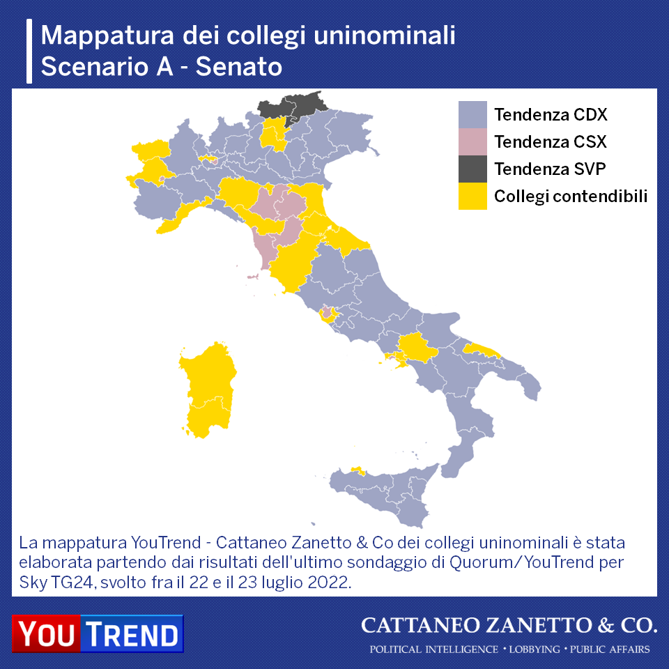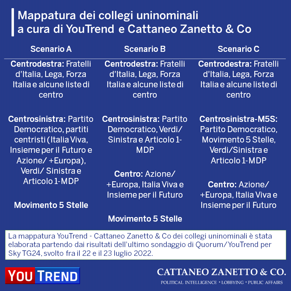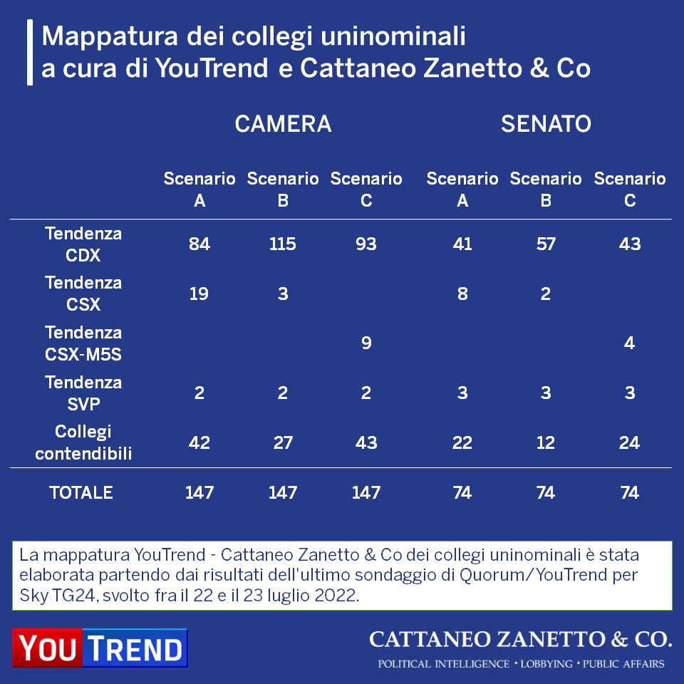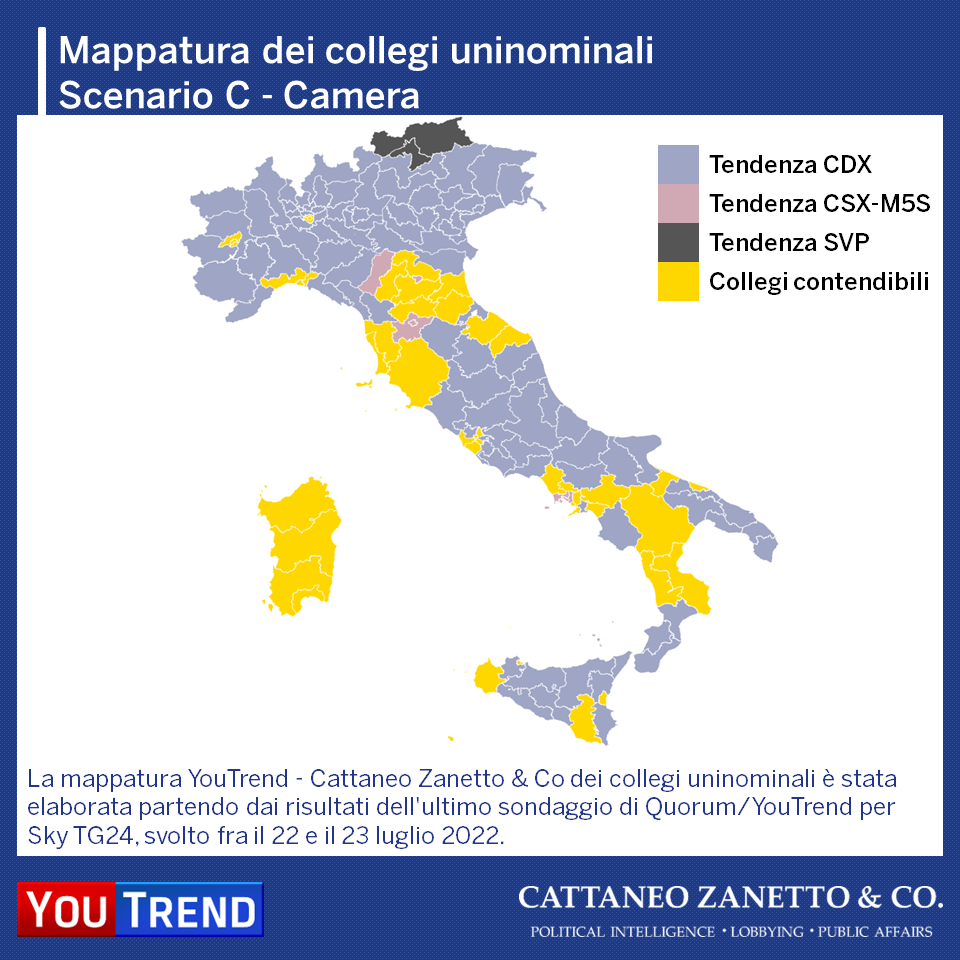 La mappatura considera 3 scenari ed è basata sulle percentuali dei partiti dell’ultmo sondaggio YouTrend per Sky TG24.