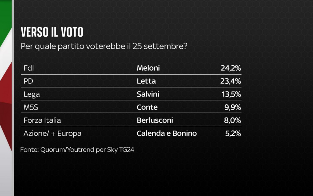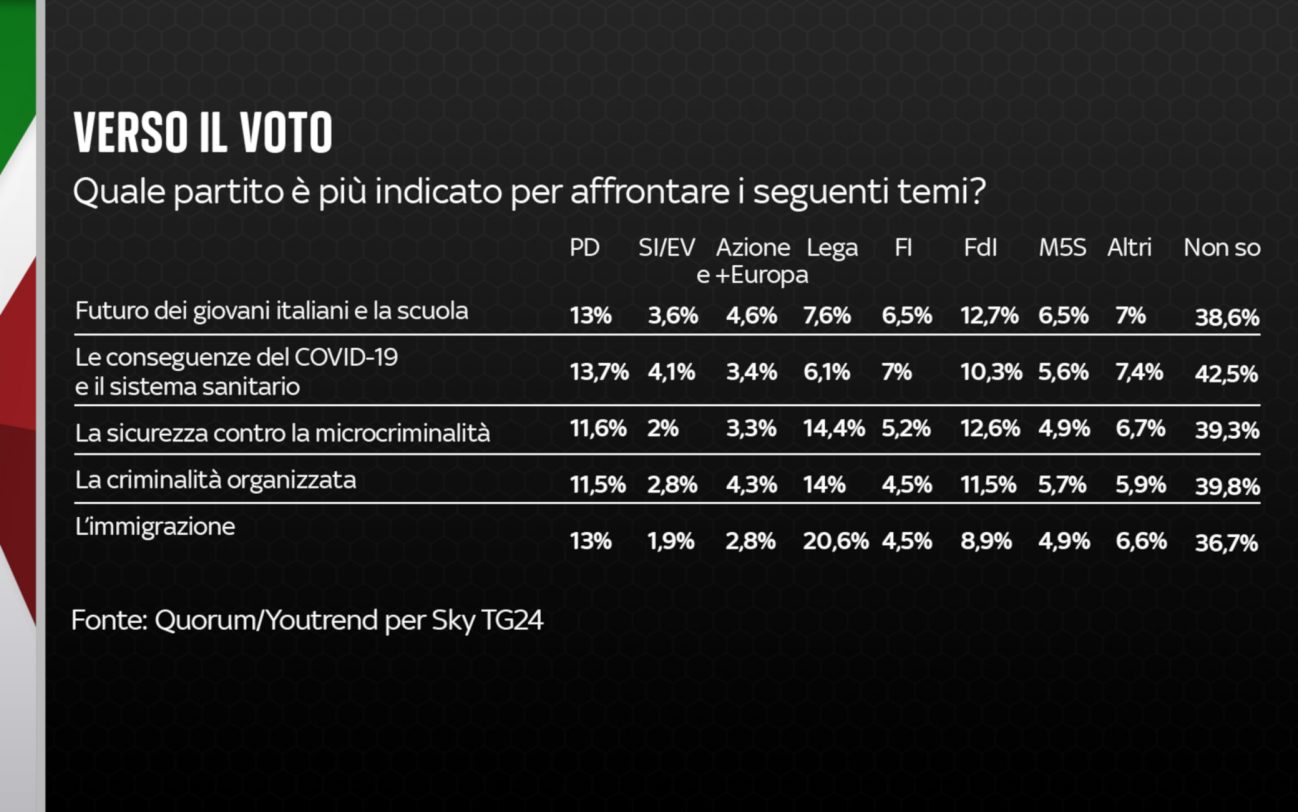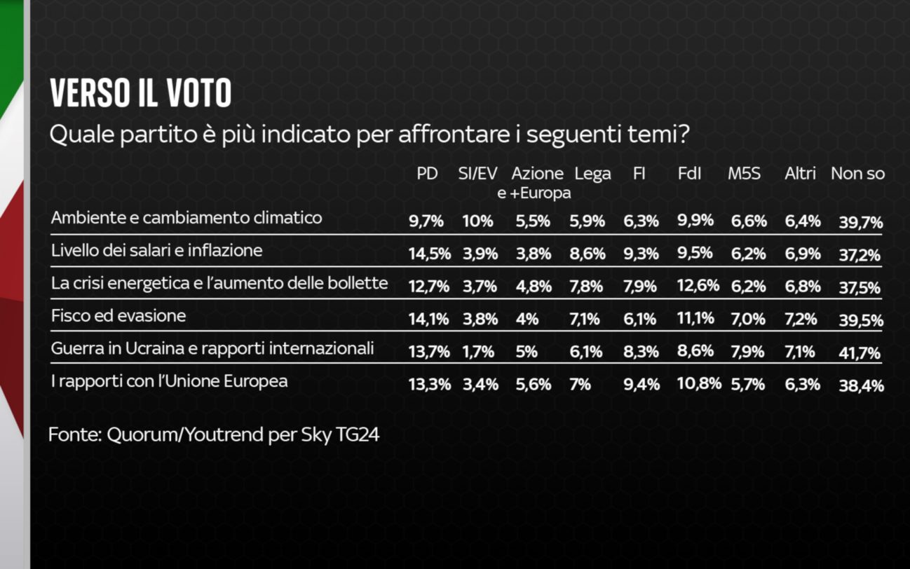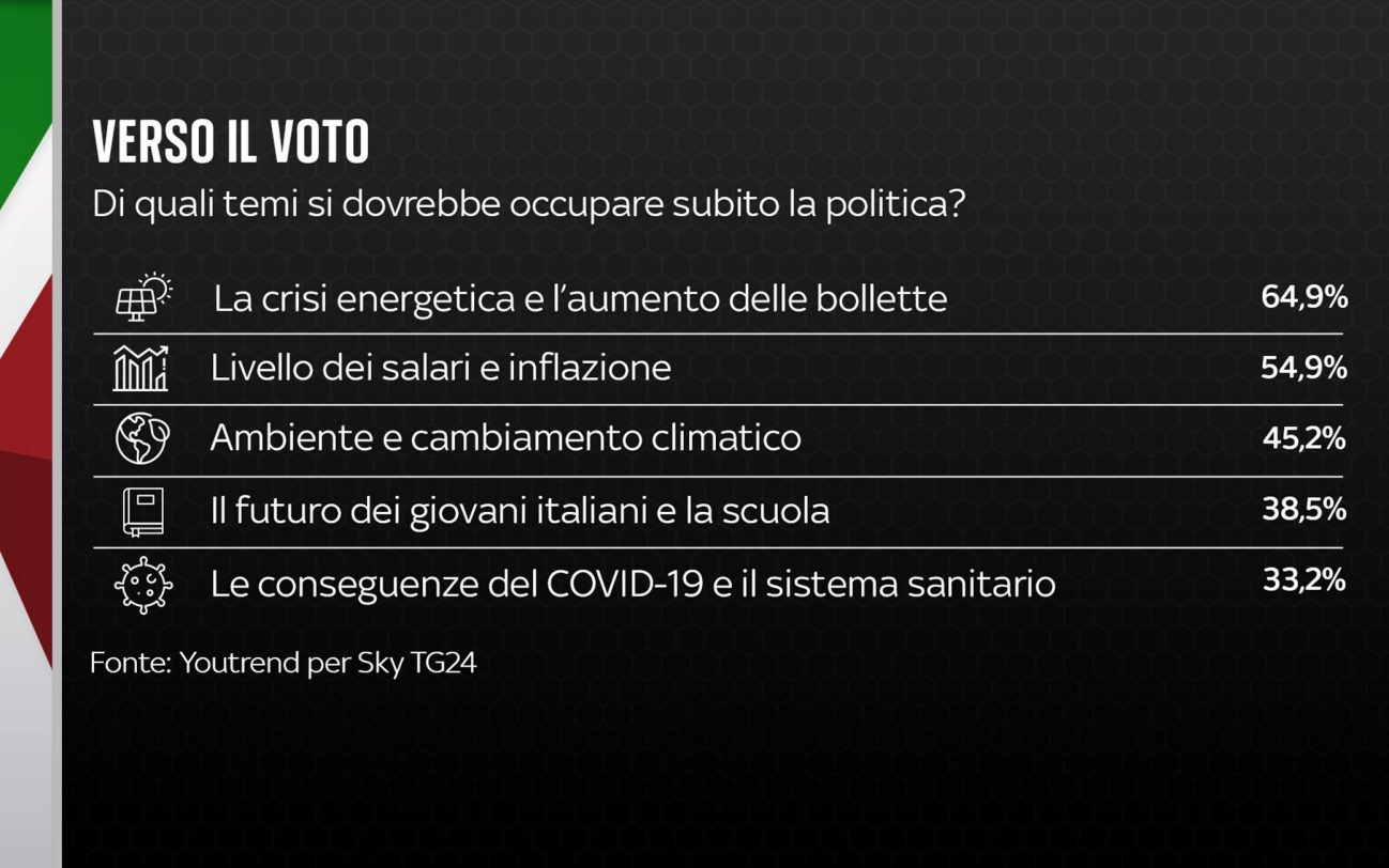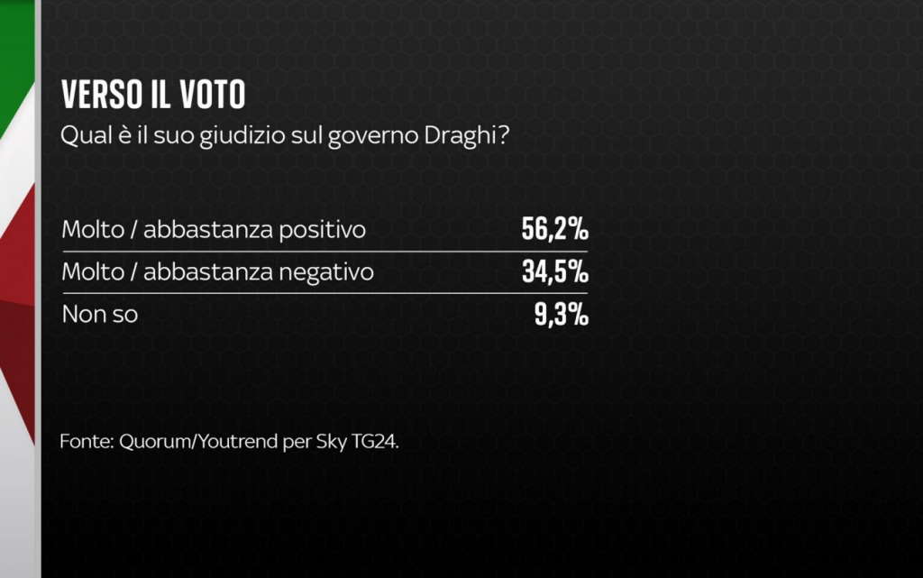 Nota metodologica: sondaggio di 1.000 interviste svolte tra il 29 e il 31 Luglio 2022 su un campione rappresentativo della popolazione italiana, suddiviso per quote di genere ed età incrociate, stratificate per titolo di studio e ripartizione Istat di residenza. Il margine d’errore generale è del +/- 3,1%, con un intervallo di confidenza del 95%