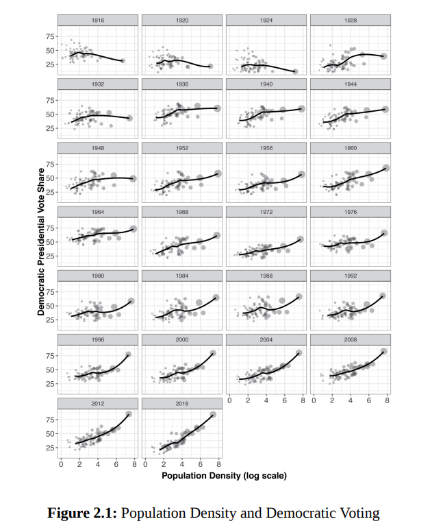 La concentrazione degli elettori progressisti nelle città è un fenomeno che negli Stati Uniti è in atto da decenni. Già nel 1960 si inizia a vedere una correlazione tra la densità abitativa e i voti ai Dem, ma è nel 2016 che questa relazione è diventata estremamente forte. Rodden identifica varie spiegazioni per questo fenomeno, ma il punto fondamentale è che il Partito Democratico si è trasformato da partito operaio a partito urbano.