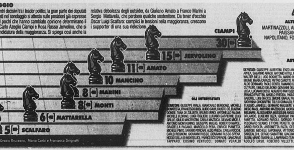 Politica Quali nomi circolavano sui giornali nelle precedenti elezioni del Quirinale? Abbiamo ricostruito quali erano i nomi che circolavano con più frequenza sui quotidiani nelle elezioni del 1999, 2006, 2013 e 2015. Francesco Cianfanelli24 Gennaio 2022